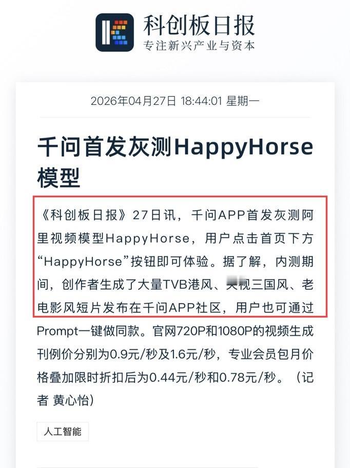 刚刚就看到消息说,千问App已经首发灰测HappyHorse 1.0,用户打开App就能使用。