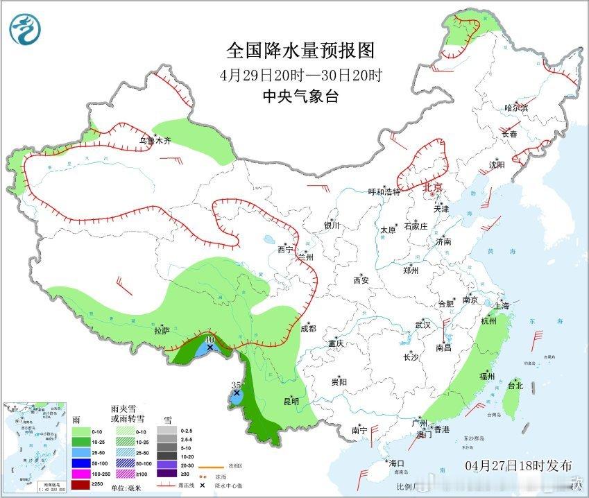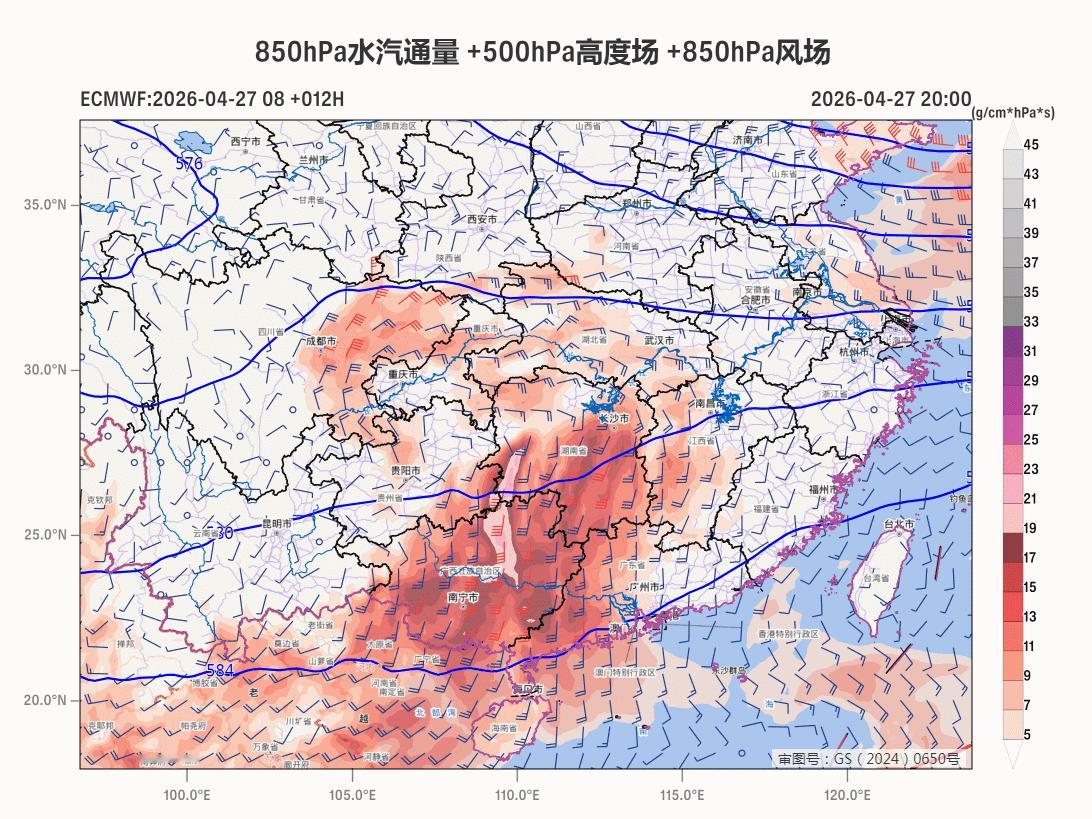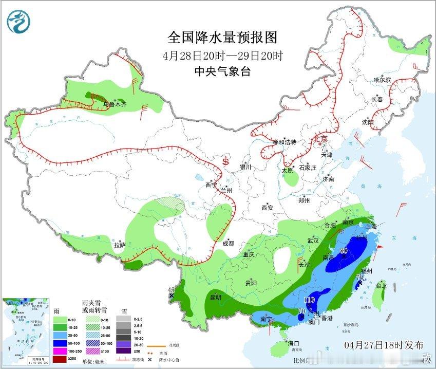 预计,4月27日20时至28日20时,四川东部和南部、重庆大部、云南西部和东部、贵州南部、江南北部和西部、华南西部、海南岛北部等地部分地区有大到暴雨,其中,湖北东南部、江西西北部、广西北部和西部等地部分地区有大暴雨(100~130毫米)。