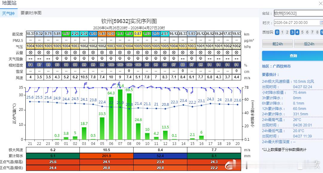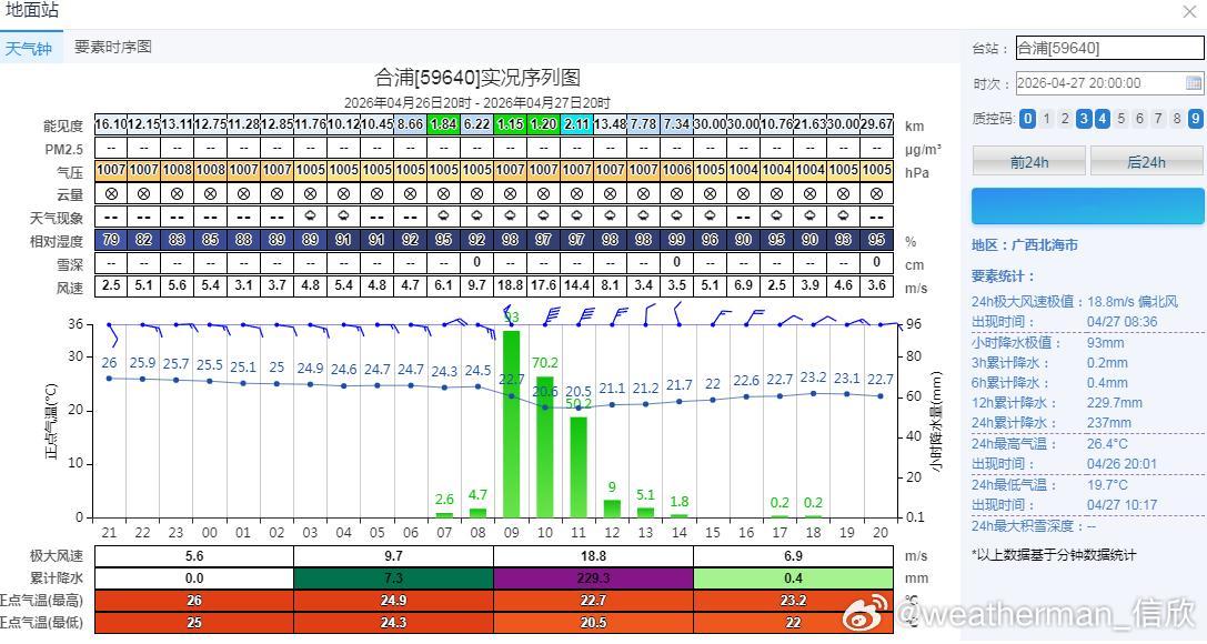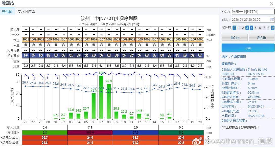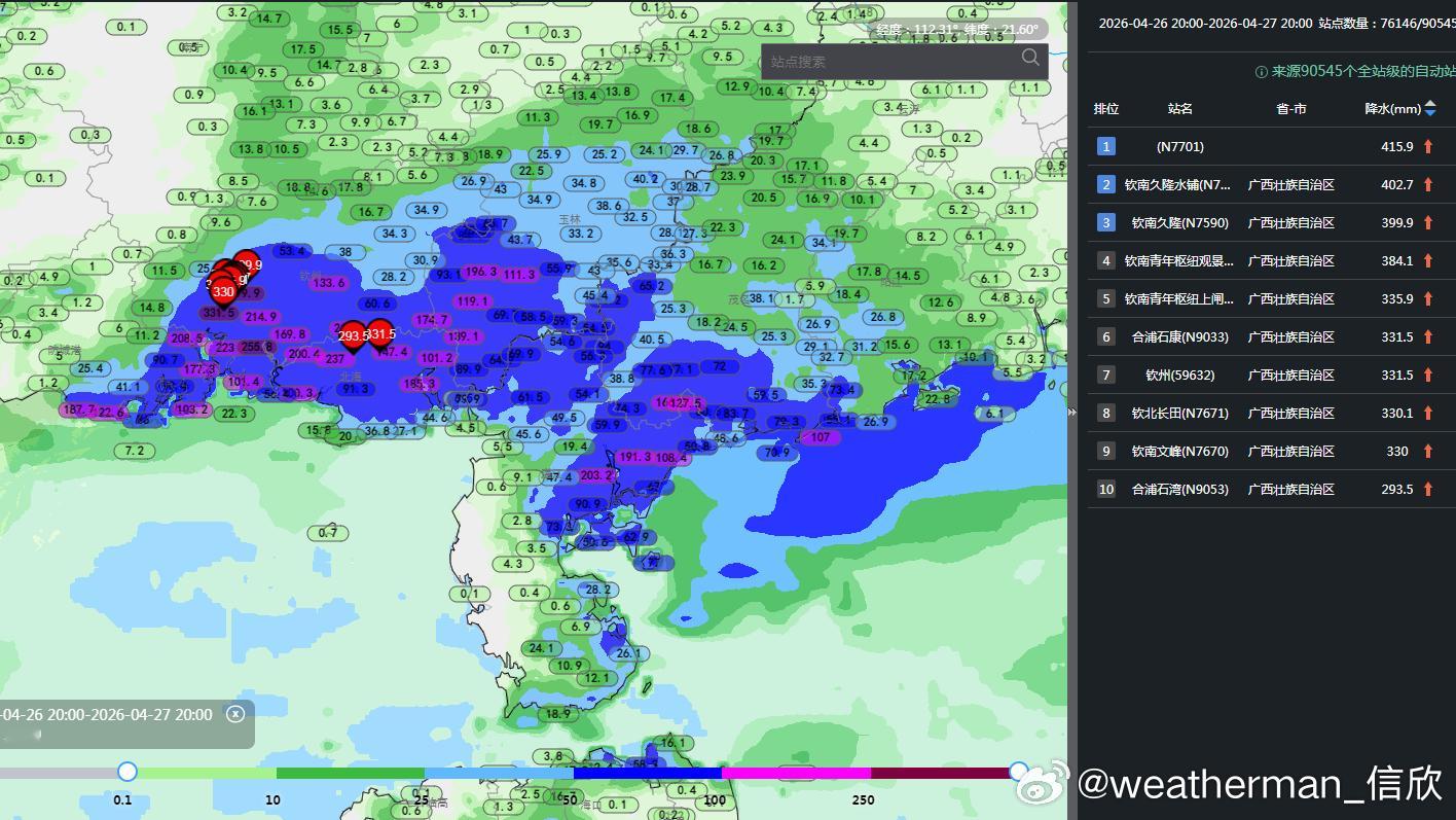 【强降雨】昨晚到今天,广西南部因为暖区对流形成列车效应,出现破纪录的强降雨,钦州331.5毫米,创当地最早特大暴雨日纪录,首次在4月出现特大暴雨。合浦237毫米,接近特大暴雨,两站均打破当地4月最强单日降雨纪录。从区域自动站看,钦州一中415.9毫米、钦南久隆水铺402.7毫米,超400毫米。