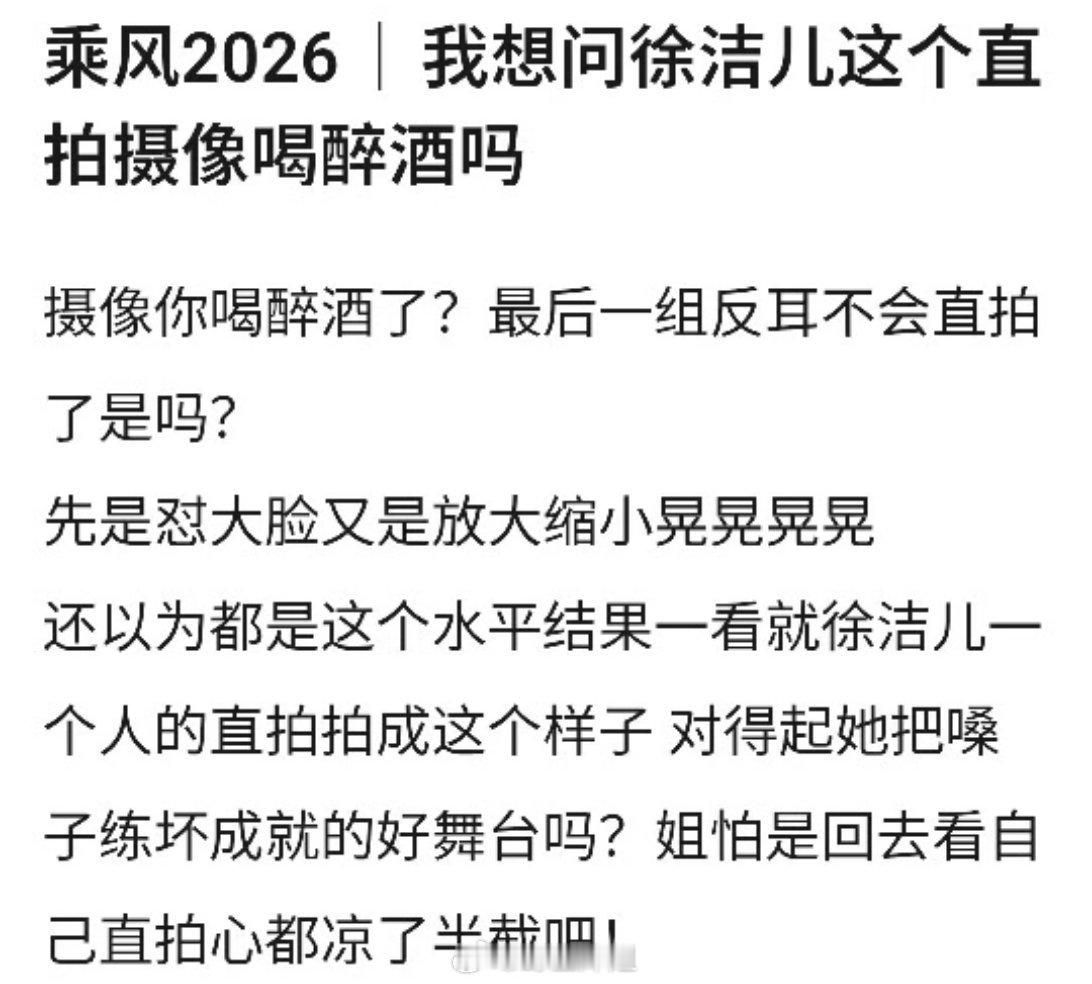 我的天啊,徐洁儿的直拍晃动的频率真的不是一点半点啊,不知道的还以为这个摄影师喝醉酒了,运镜都醉醺醺的