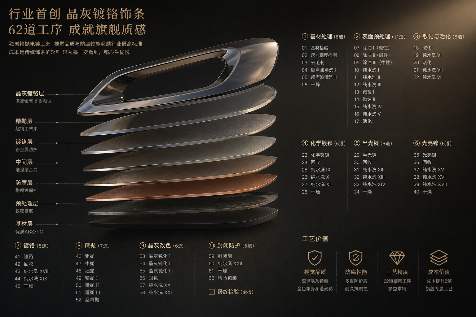 这里用AI做了个晶灰镀铬饰条的工艺爆炸图,需要来点评一下,有没有胡说八道