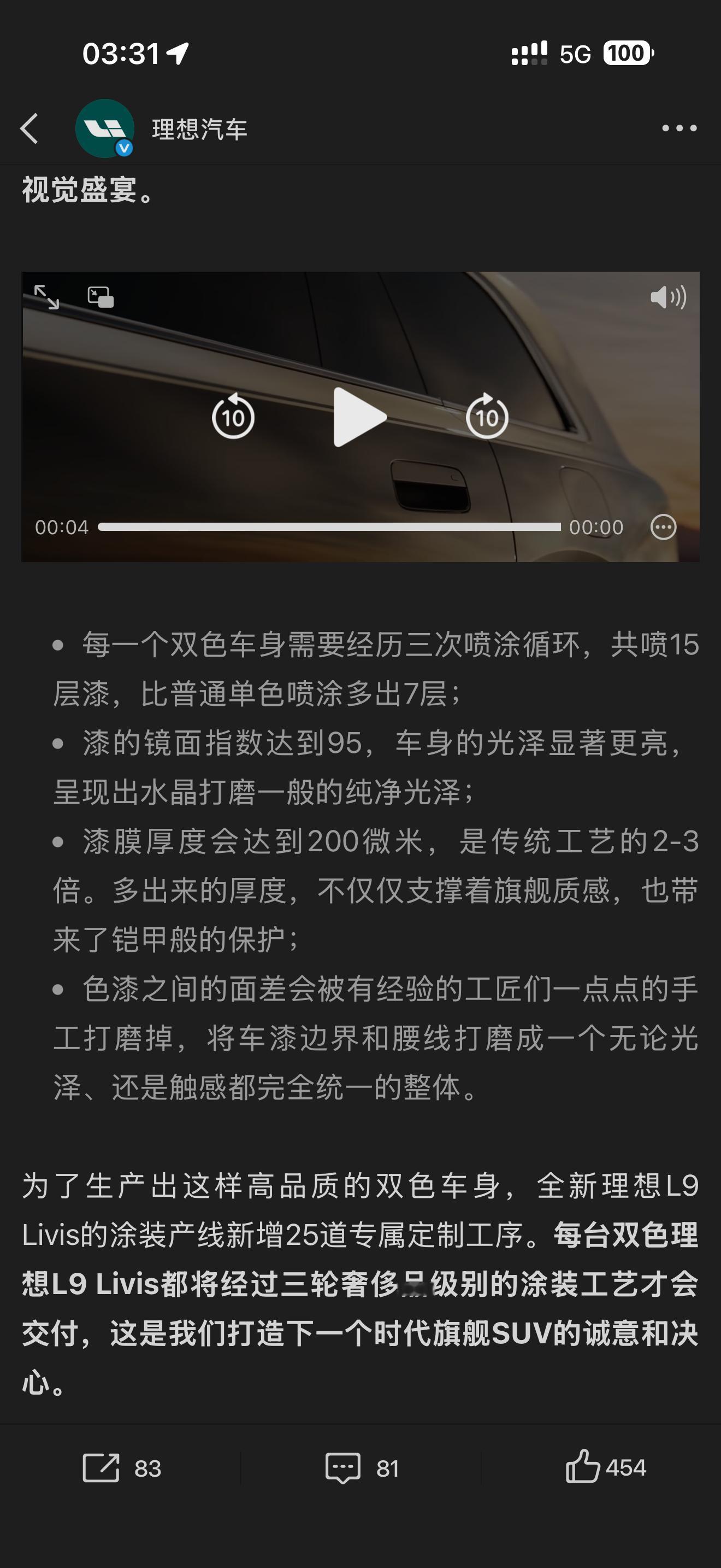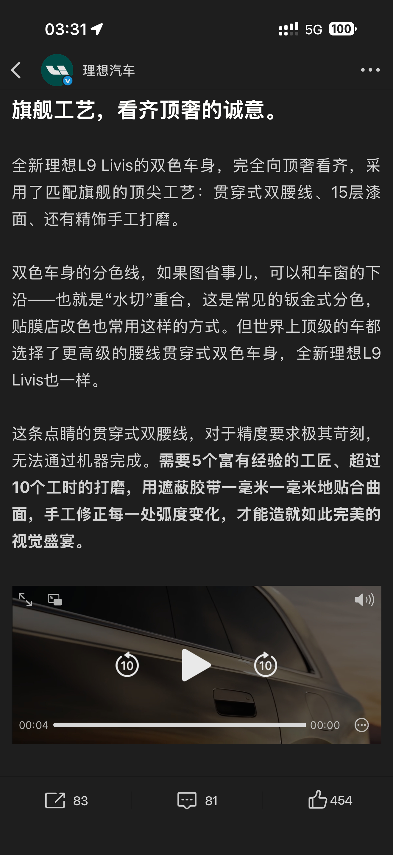 关于理想 L9 Livis 的外饰设计细节,厂家已经做了很多细节的解释。比如取消了超声波传感器的孔,选用了 UWB替代做了无瑕车身;双色车漆+腰线的复杂喷涂工艺;在铝基材上做的晶灰镀铬饰条,需要62道工艺等等,可以参考全新理想L9 Livis:旗舰设计进化论,以家的最高标准,打造新旗舰。