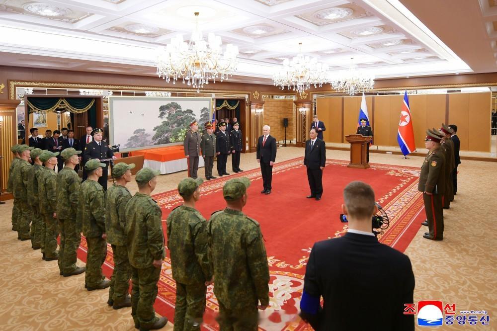 为出席海外军事作战功勋纪念馆竣工典礼到访我国的俄罗斯联邦国防部长安德烈·别洛乌索夫和一行、俄罗斯联邦驻朝鲜大使馆国防武官阿列克谢·巴尔图索夫参加了授勋仪式。