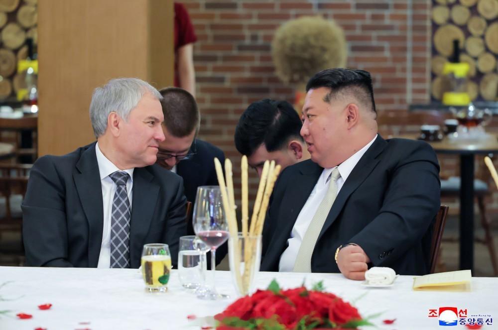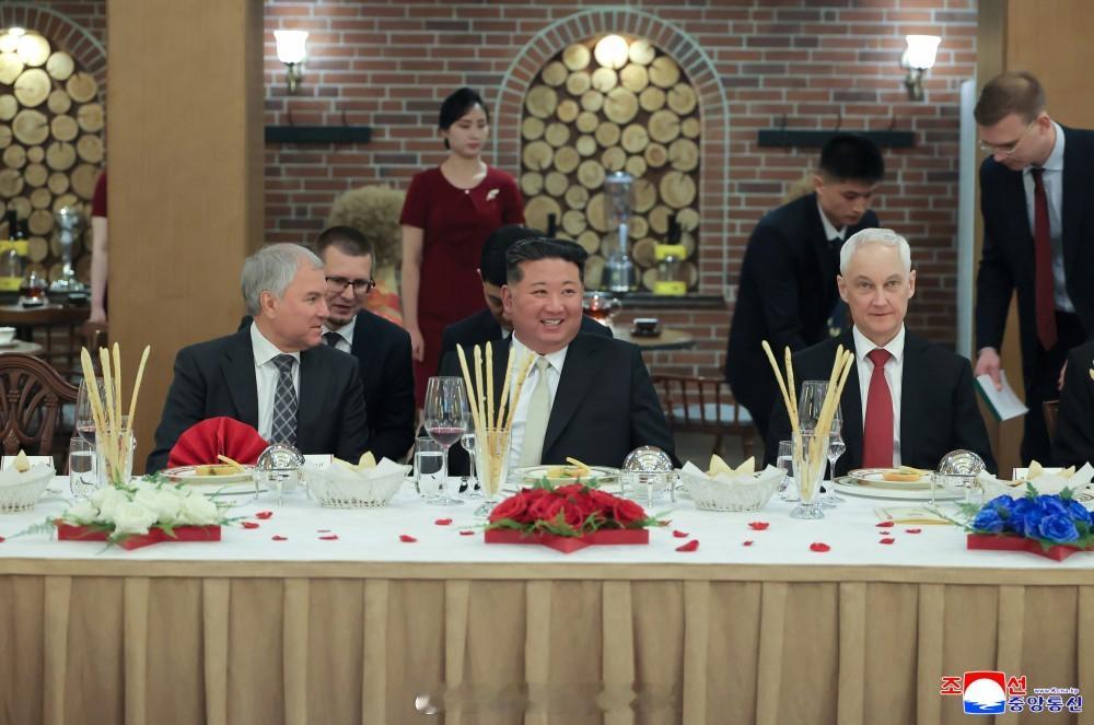 朝中社平壤4月27日电 朝鲜民主主义人民共和国国务委员会4月26日举行晚宴,欢迎出席海外军事作战功勋纪念馆竣工典礼的俄罗斯联邦国家杜马主席维亚切斯拉夫·维克多罗维奇·沃洛金和国防部长安德烈·别洛乌索夫等俄罗斯联邦官方代表团。