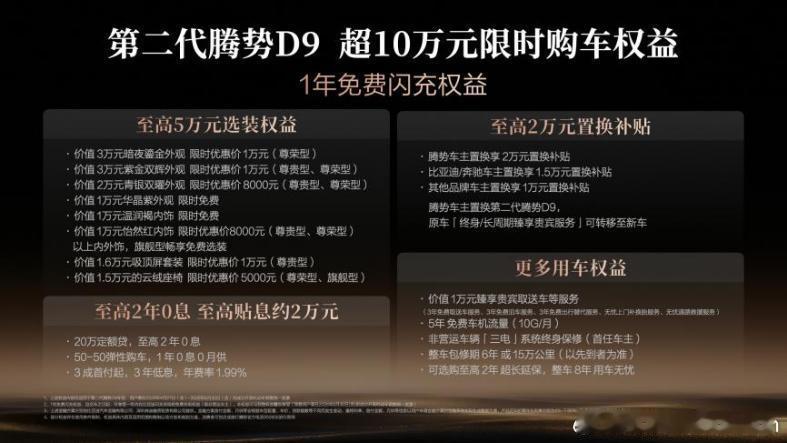 为感恩新老用户的支持和信赖,即日下订第二代腾势D9,可享至高价值超10万元限时购车权益!包含12个月免费闪充权益以及2年0息或3年低息等金融方案。此外,本次置换权益诚意十足:腾势车主可以享受2万元的置换补贴,比亚迪或者奔驰车主可以享受1.5万元的置换补贴,其他品牌车主也可以享受1万元的置换补贴。