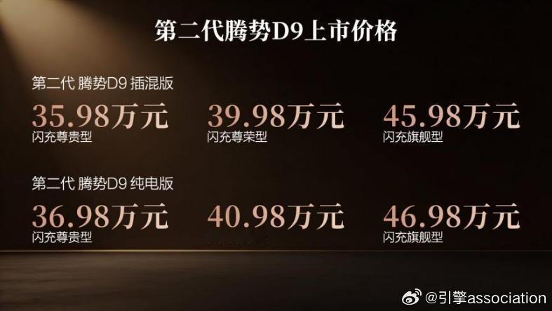 4月27日,科技豪华旗舰MPV——第二代腾势D9震撼上市,推出插混版3款、纯电版3款,共计6款车型,官方指导价35.98万元—46.98万元。为了满足用户对于豪华出行的极致追求,第二代腾势D9搭载比亚迪第二代刀片电池及闪充技术、全球首创「合元」超集成动力平台、天神之眼 5.0辅助驾驶系统、双阀云辇-C等前瞻科技,带来九大新迭代,在美学、空间、舒适、科技、安全等全面进阶,重塑豪华MPV价值新标杆。