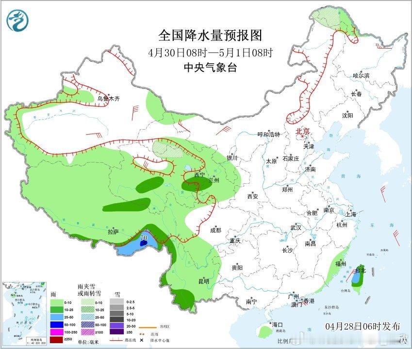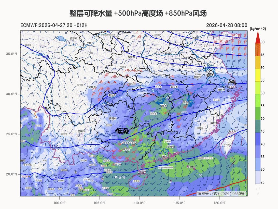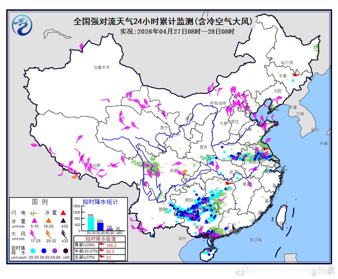 今天强降雨和强对流继续,区域随低涡有所东移。今晨中央气象台继续发布暴雨黄色预警和强对流天气蓝色预警:预计,4月28日08时至29日08时,重庆中部、云南东部、江淮南部、江南中西部、华南中西部等地部分地区有大到暴雨,其中,安徽南部、江西北部、广西东北部、广东西北部等地部分地区有大暴雨(100~130毫米)。