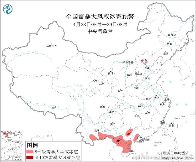 预计4月28日08时至29日08时,华南中西部、西南地区南部等地的部分地区将有8级以上雷暴大风或冰雹天气,其中,广西东部和南部等地的部分地区将有10级以上雷暴大风,最大风力可达11级以上;
