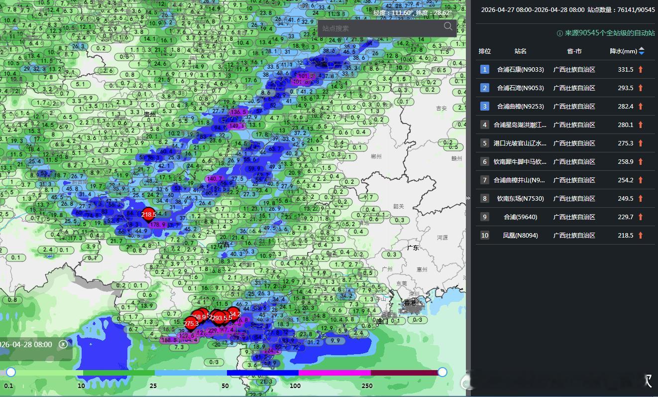 华南中西部、西南地区南部等地的部分地区将有小时雨量大于20毫米的短时强降水天气,其中,广西东北部、广东中西部和南部沿海等地的部分地区小时雨量大于50毫米,最大可达60毫米以上。