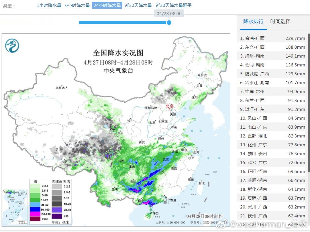 【强降雨和强对流】昨天到今晨,广西贵州湖南广东等地,因为低涡切变线影响,出现强降雨,广西南部因为暖区对流的列车效应,合浦局地出现特大暴雨,24小时雨量超250毫米。而且在低涡南侧偏南风里的广东广西贵州湖南,低涡北侧偏东风里的湖北河南安徽江苏等地出现短时强降雨等强对流天气。