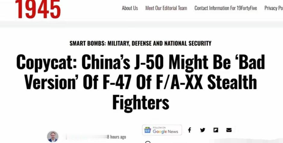《1945》网站在2025年4月就发过文章说,F-47的发布时间距离歼-50亮相就几个月,这绝非巧合,明显是想遮掩落后的尴尬。到了2026年,《1945》网站又换了个打法——不承认落后,改说歼-50是仿制品。