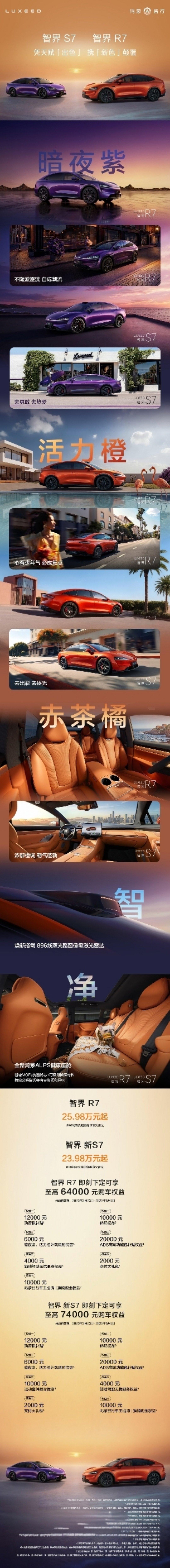 在 3 月 23 日的华为春季全场景新品发布会上,鸿蒙智行智界 R7 / 新 S7“双 7”车型焕新发布。新车带来了「暗夜紫」和「活力橙」两款新配色,并拥有全新 896 线双光路图像级激光雷达和全新鸿蒙 ALPS 健康座舱,售价 25.98 万元 / 23.98 万元起。
