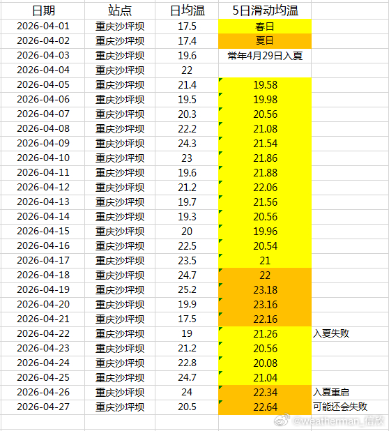 【季节】近期冷空气活跃,导致入季进程处于停滞状态。近期重庆在夏和春之间反复,目前虽然看似又开启入夏,但最近气温下降,这轮入夏可能还会失败。未来南方阴雨依然较多,气温偏低,入夏还要再等等。