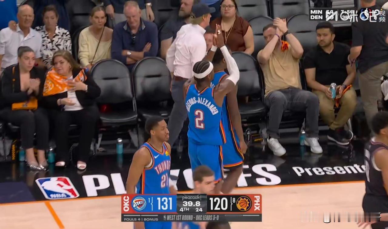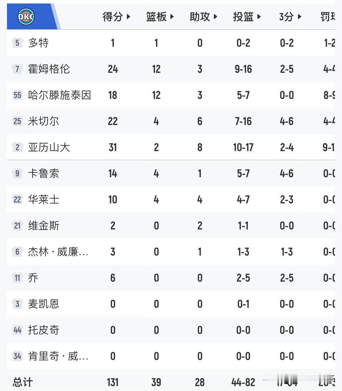 再看雷霆,亚历山大31分,米切尔22分,哈滕18分,切特24分,太阳肯定在想,如果遇到的不是雷霆就好了,我都打成这样了还是赢不了。