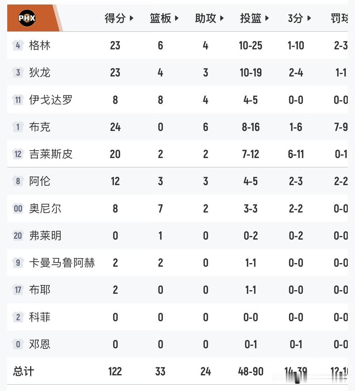 太阳今天打的还算努力吧,首发五人中,四人拿到了20+,格林23分,狄龙23分,布克24分,吉莱斯皮20分,但是布克和格林的三分合计16中2,很拉垮。