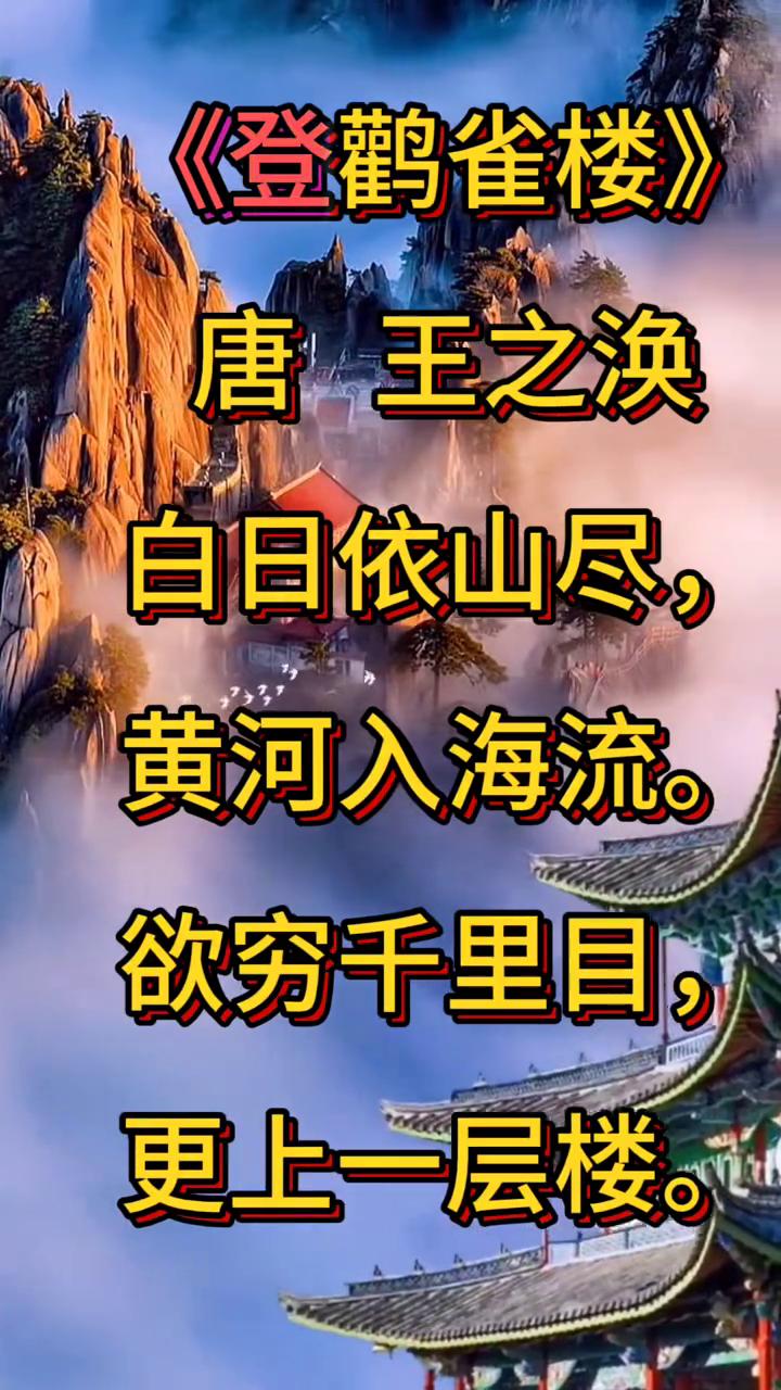 《登鹳雀楼》 唐,王之涣。 白日依山尽,黄河入海流。 欲穷千里目,更上一层楼。 这首诗描绘了诗人登上鹳雀楼后远眺的壮丽景象。夕阳傍着群山缓缓西落,黄河奔腾不息汇入大海后两句则升华出站得高才能看得远的深刻哲理,成为千古传颂的名句。