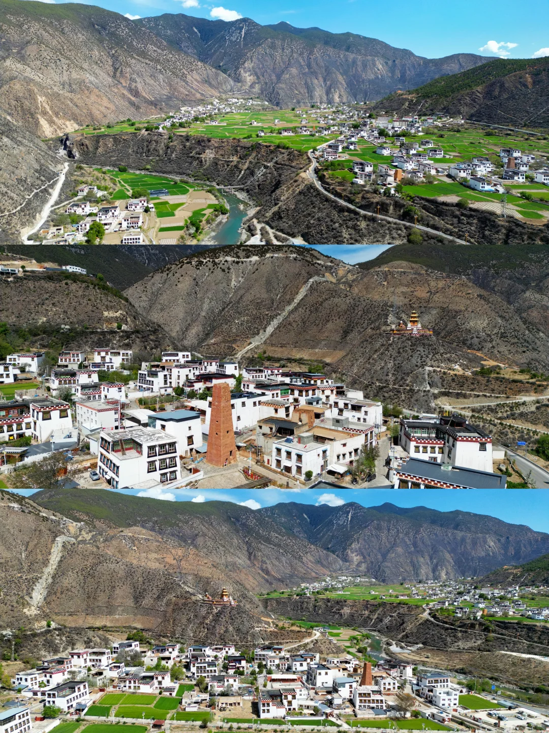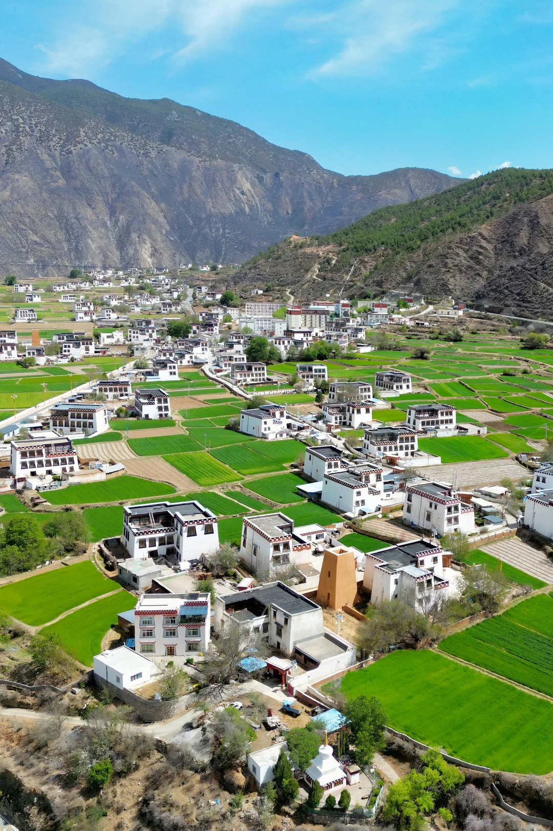 那一幢幢白色藏房点缀在河谷与青稞田间,像极了上帝不小心打翻的牛奶盒。