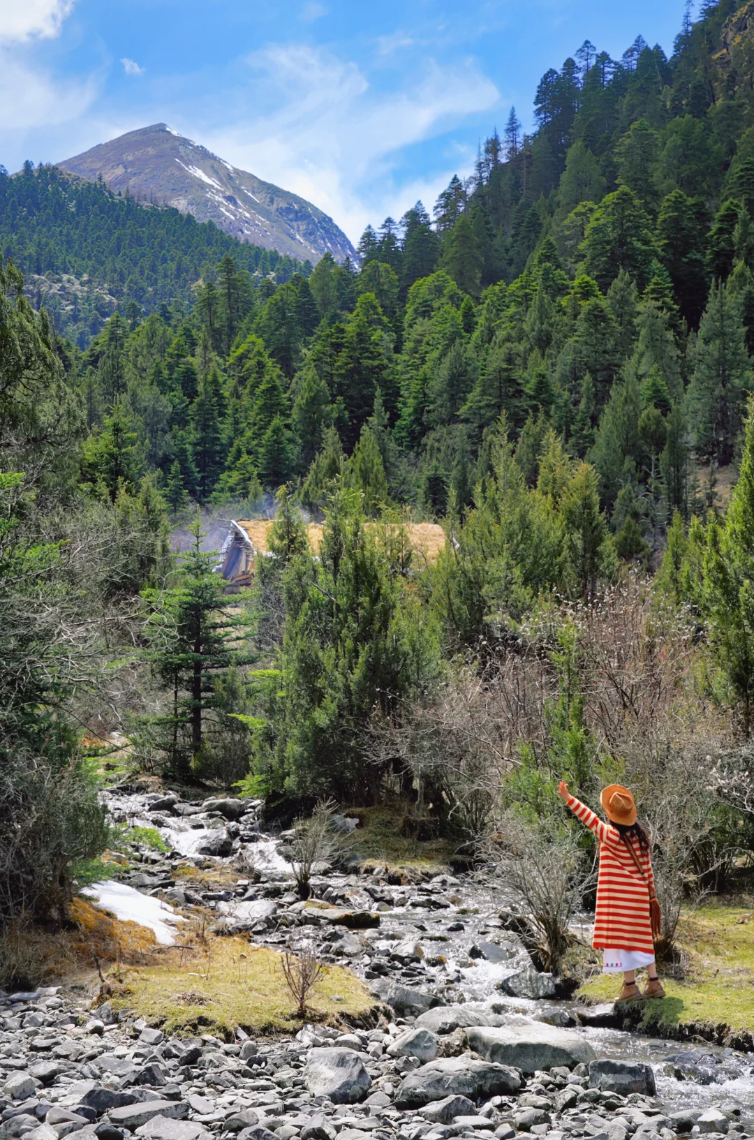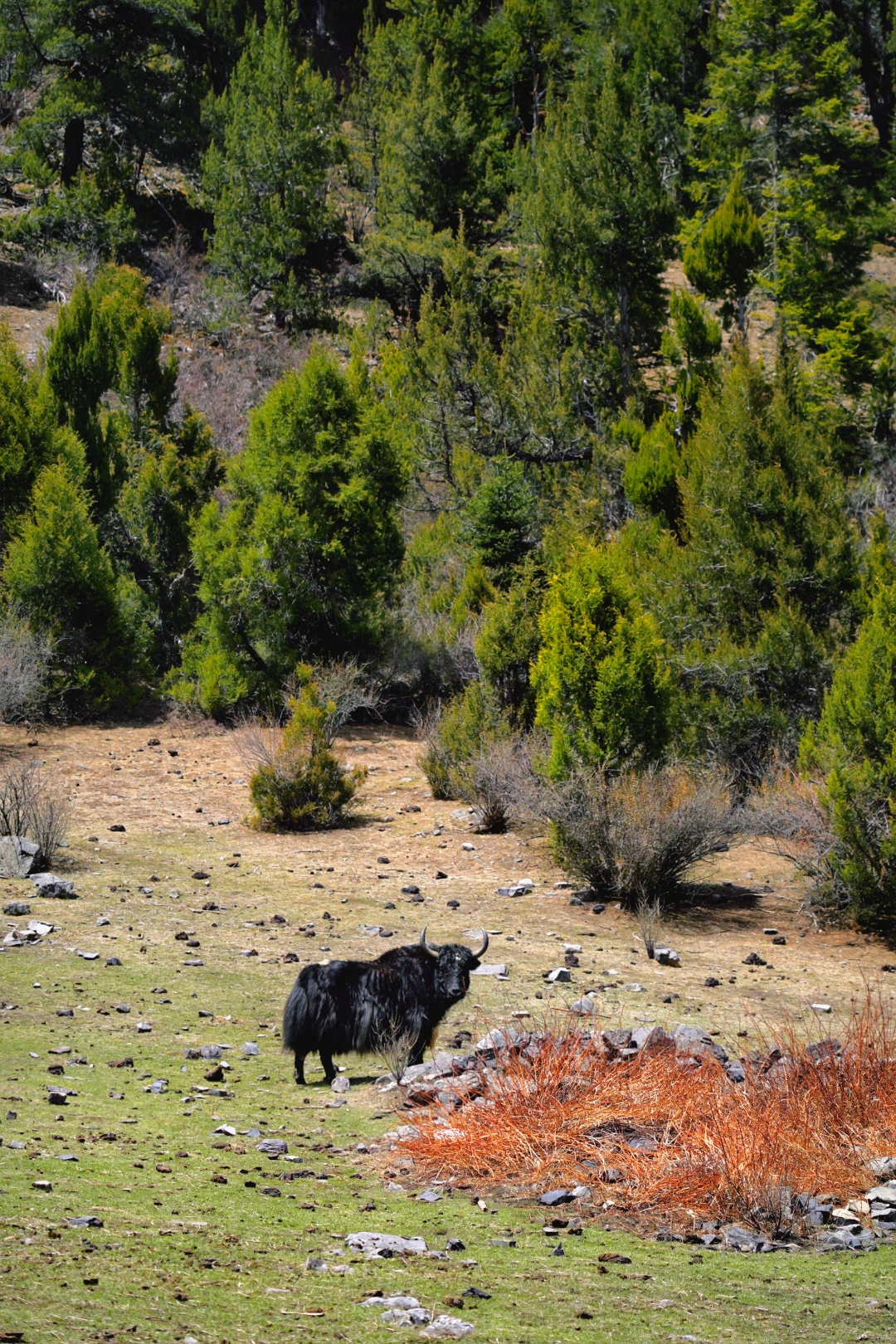 当走出密林,眼前豁然开朗:大片草甸牧场铺展开来,牦牛悠闲地甩着尾巴吃着草。