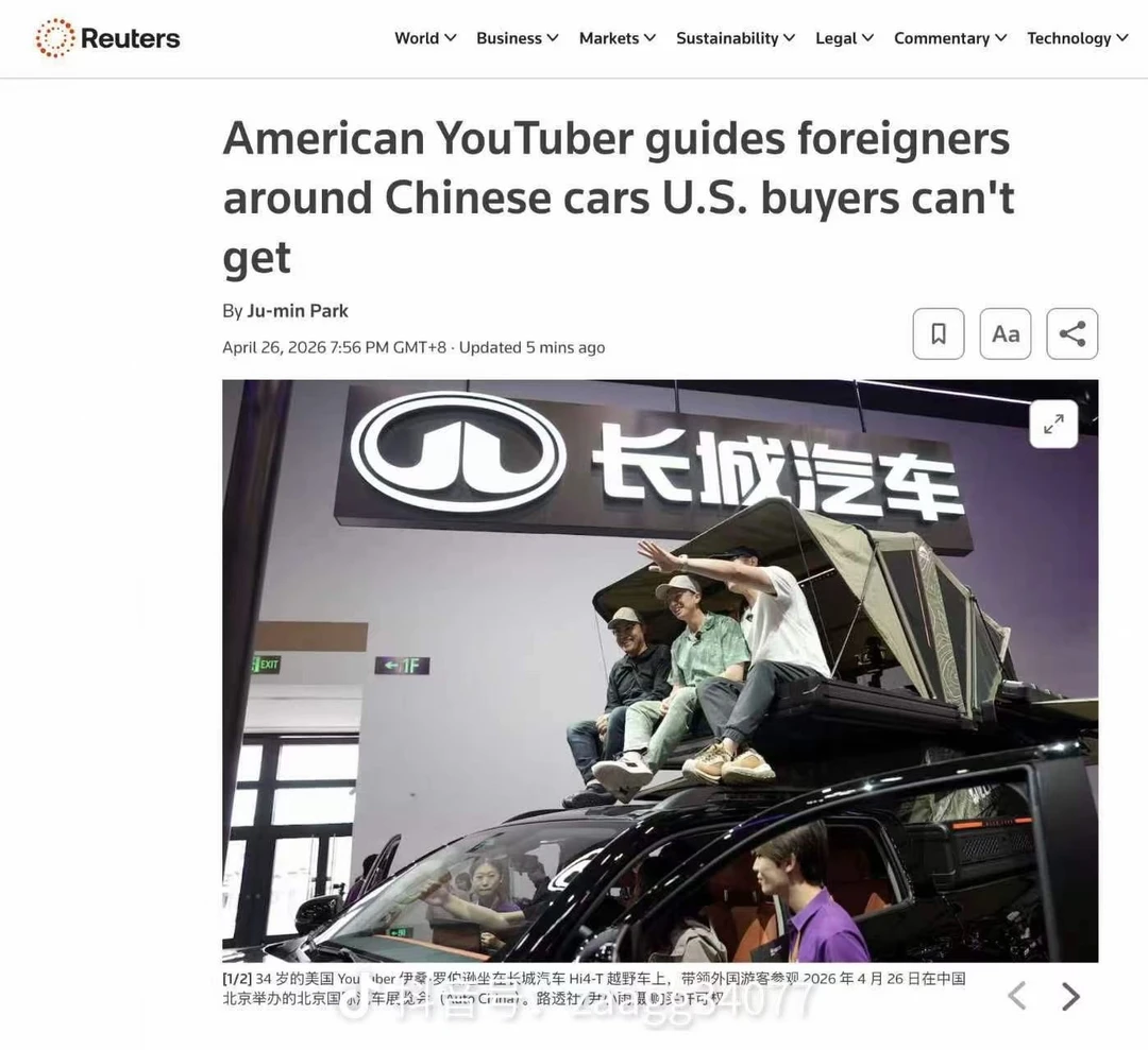 外媒:美国YouTuber伊桑·罗伯逊在北京车展带领十余名外国游客参观中国电动汽