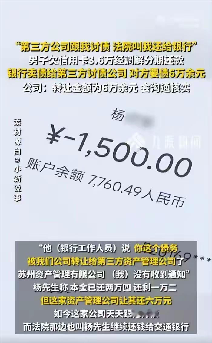 比高利贷还黑?浙江温州,男子因遇到了难处,欠了银行36000元,每月还1500,已经还了24000的本金,只剩下12000没还。不料,在没经他同意的情况下,银行把他的债务,打包卖给了第三方公司,本来还剩12000的本金,对方张口就要60000,这还不算,对方还天天找他讨债,日子都快过不下去了。