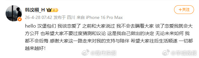 【#韩汶栩发文官宣恋情#】4月28日,发文官宣恋情:“hello 汉堡包们 我谈恋爱了 之前和大家说过 我不会去瞒着大家 谈了恋爱我就会大方公开 也希望大家不要过度猜测和议论 这是我自己做出的决定 无论未来如何 我都不会后悔 感谢大家这一路走来对我的支持与陪伴 希望大家往后生活顺遂 一切都越来越好! ”(现代快报)更多消息:#蔡卓妍结婚##韩汶栩聊天记录里怀孕和官宣不是同一人##王亚飞 迪丽热巴##韩汶栩 在红树林吹号的鹦鹉鱼##奔跑吧直播##陈伟霆曝何穗生产过程不太顺利#(编辑:惠天骄;审签:周乐瑞)