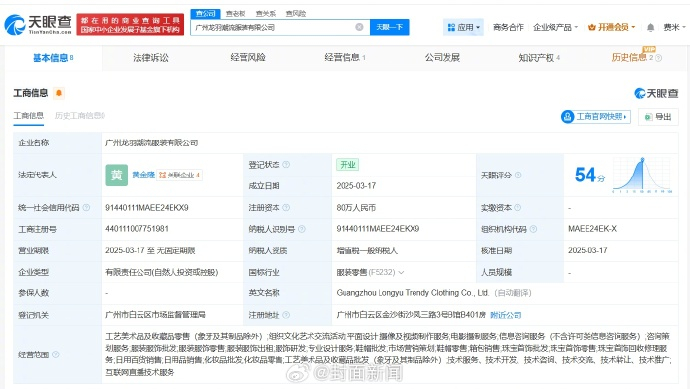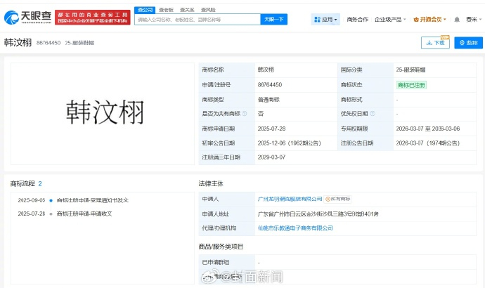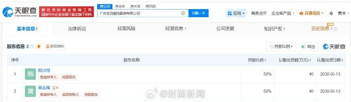 天眼查App显示,韩汶栩名下关联1家企业,为广州龙羽潮流服装有限公司,该公司成立于去年3月,法定代表人为黄金隆,注册资本80万人民币,经营范围包括工艺美术品及收藏品零售、组织文化艺术交流活动、平面设计等,由韩汶栩、黄金隆共同持股。知识产权信息显示,近期,该公司已注册“韩汶栩”商标,国际分类为服装鞋帽。#韩汶栩 在红树林吹号的鹦鹉鱼##韩汶栩 孩子#(封面新闻)