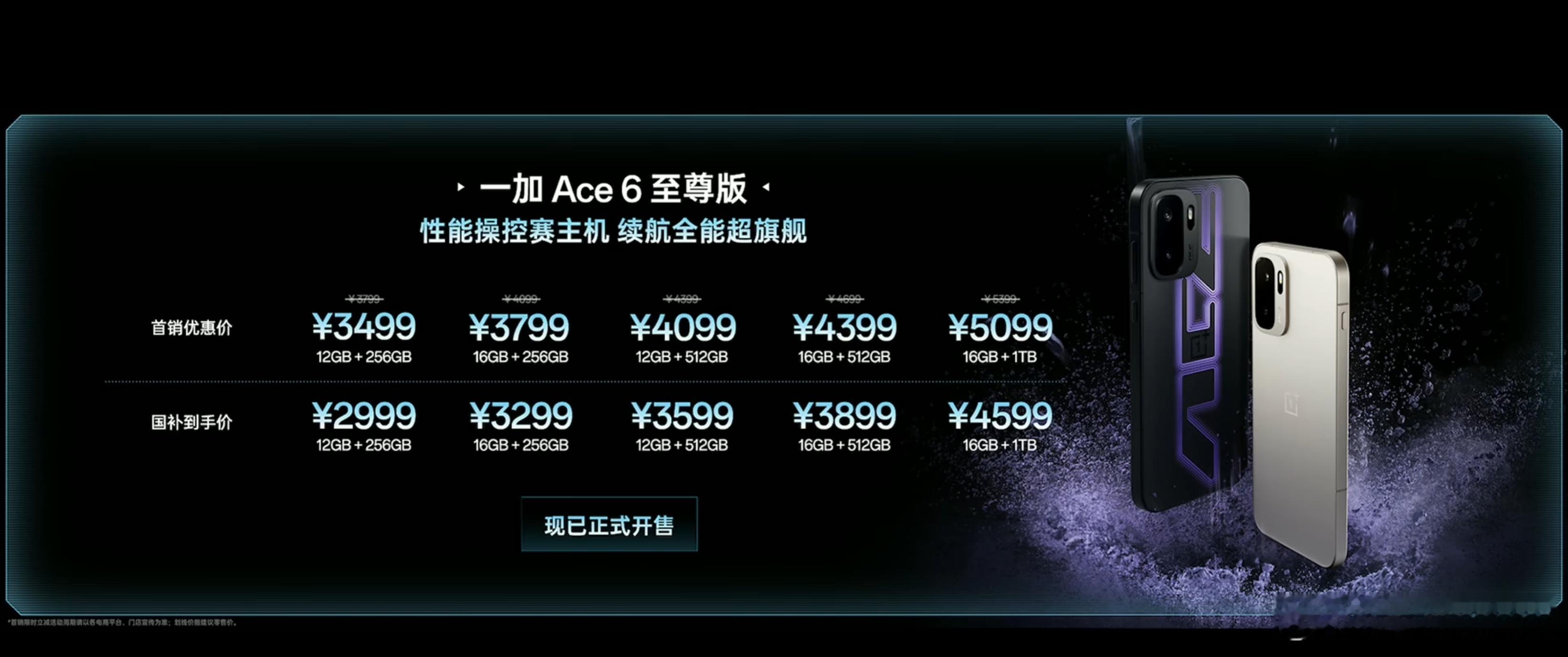 一加 Ace 6 至尊版价格出来了,12+256,349916+256,379912+512,409916+512,439916+1TB,5099枪神手柄449,和手机一起购买减50。