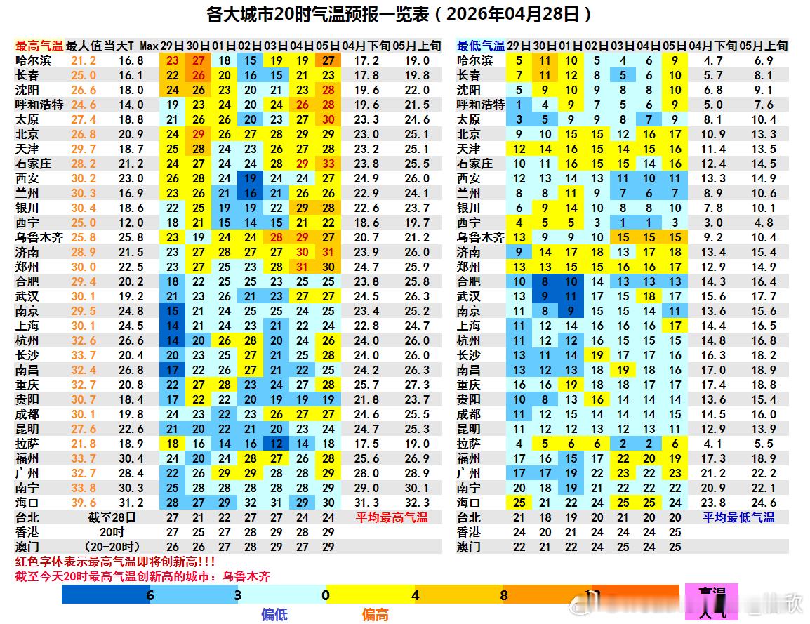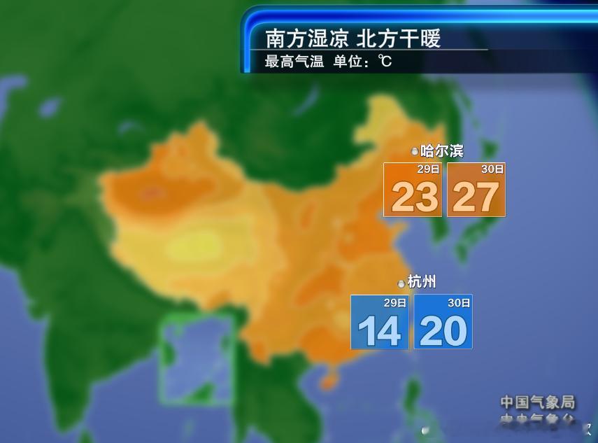 明天浙江南部、福建北部、江西中部等地降温明显。但在北方大部到四川盆地和长江中下游,气温会回升。明后2天的升温,使得南北方气温出现倒挂,东北华北黄淮的气温,明显高于江南地区,比如哈尔滨比杭州高出7-8℃。
