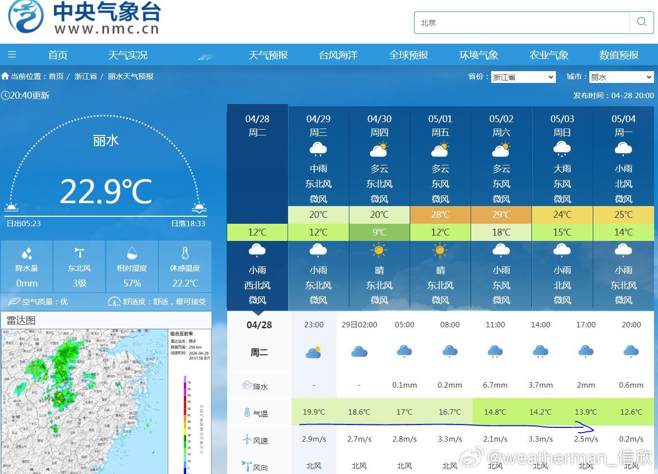 【气温波动】未来的气温走势依然多起伏,关注倒降、南北倒挂、创新高。今天下午浙江南部气温高,丽水超过了30℃。明天冷空气+阴雨,气温会倒降,下午的气温可能降至15℃以下,因此明天穿衣最好参考最低气温。