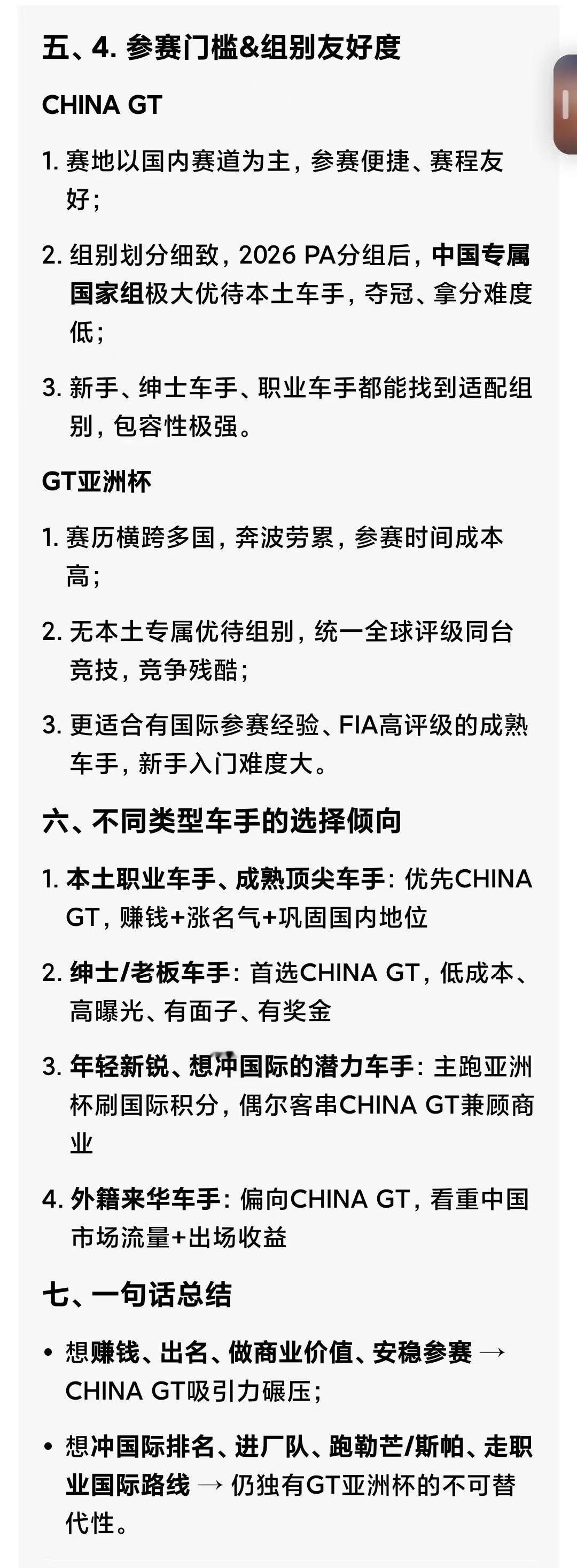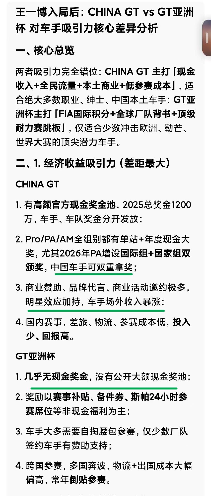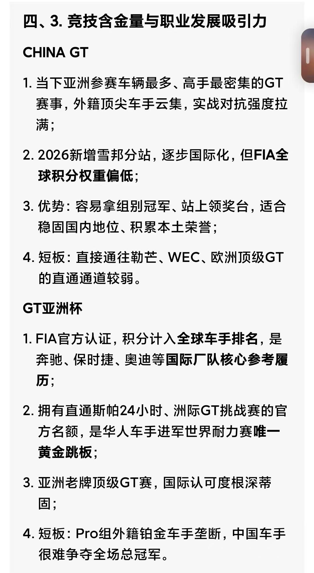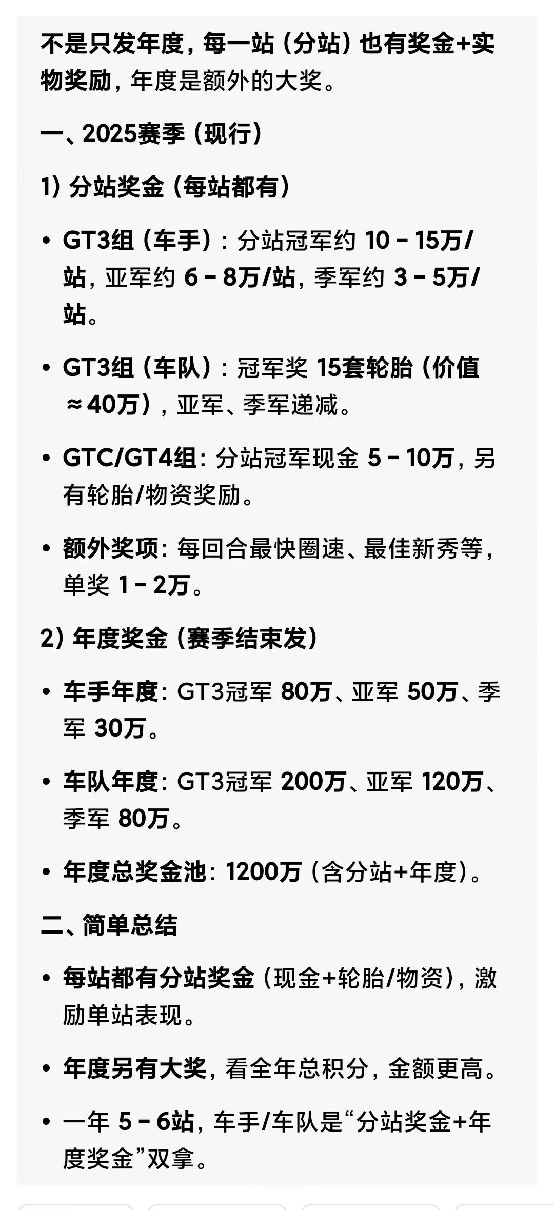 顺便豆包了一下GT亚洲杯,发现亚洲杯竟然是基本无现金奖励,其吸引车手的是FIA全球积分,顶级耐力赛跳板,走职业国际路线这些优势。(图3-5)