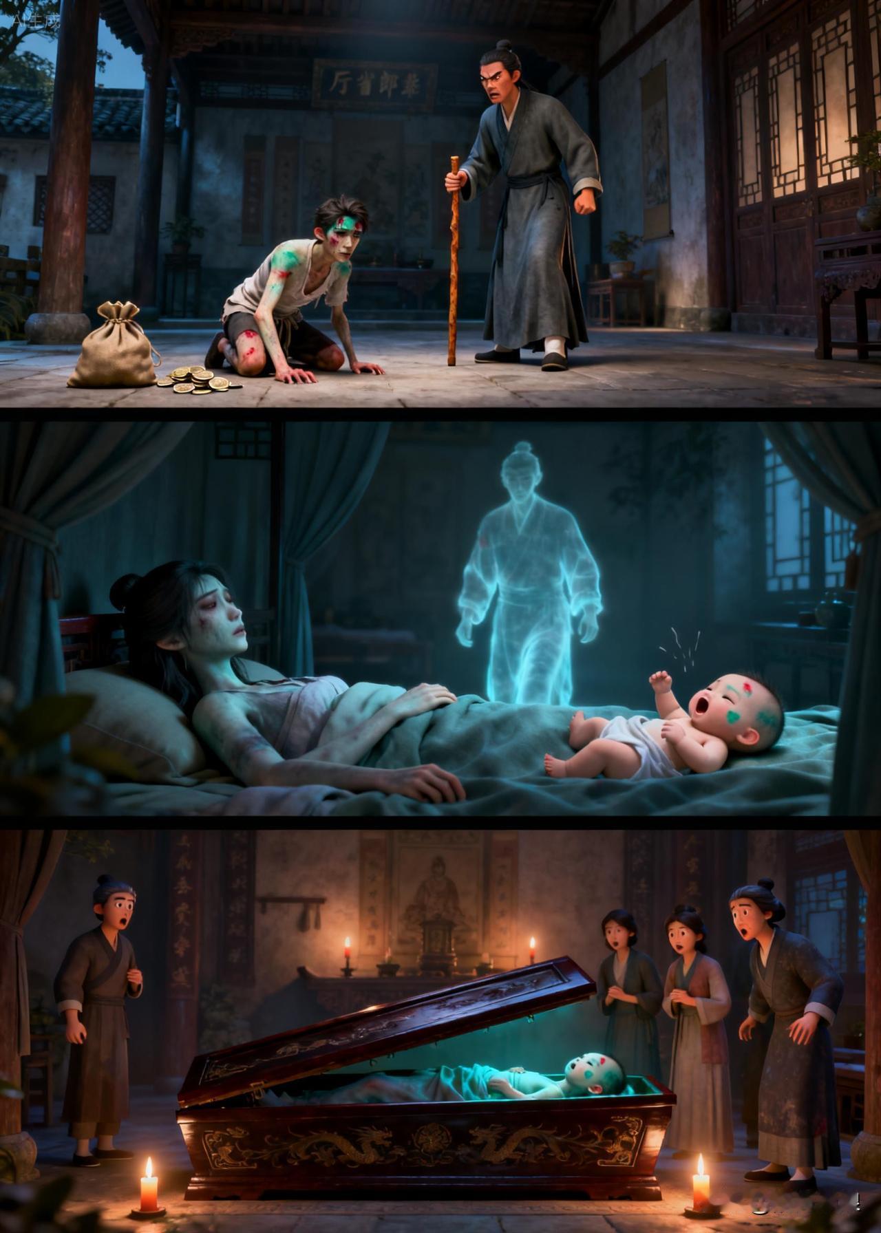 过了五天,棺材运回了,妻子与家人放声大哭,看见尸体上的青色痕迹与孩子身上的完全一样。