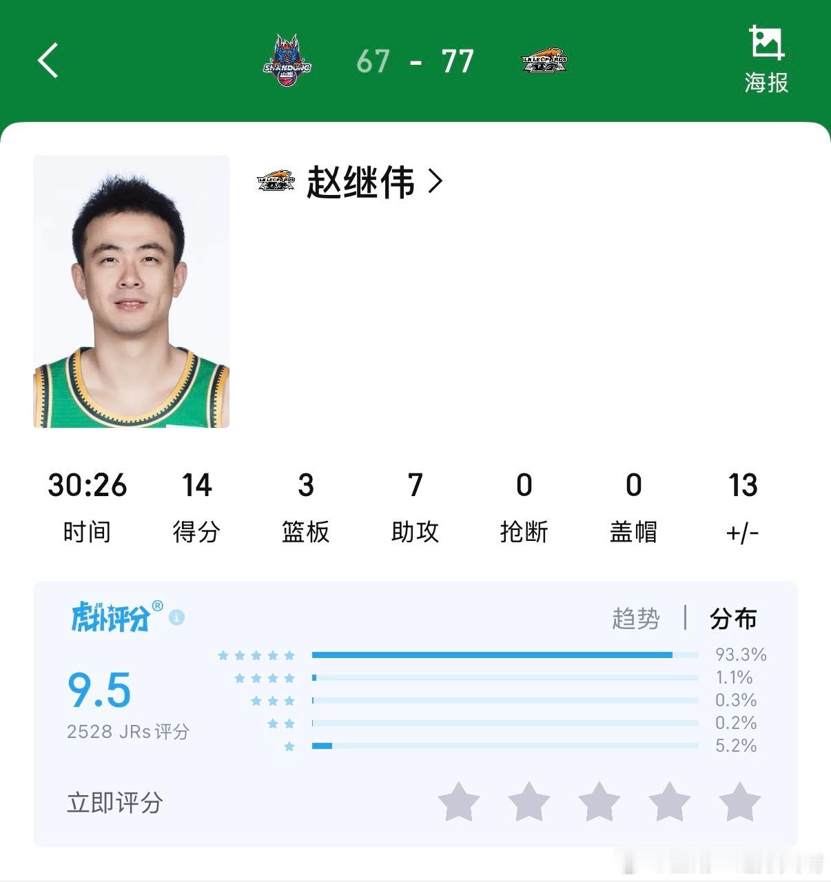 山东男篮vs辽宁男篮广东球迷崩溃了,纷纷跑到继伟的评分下面留言,祝福辽宁。