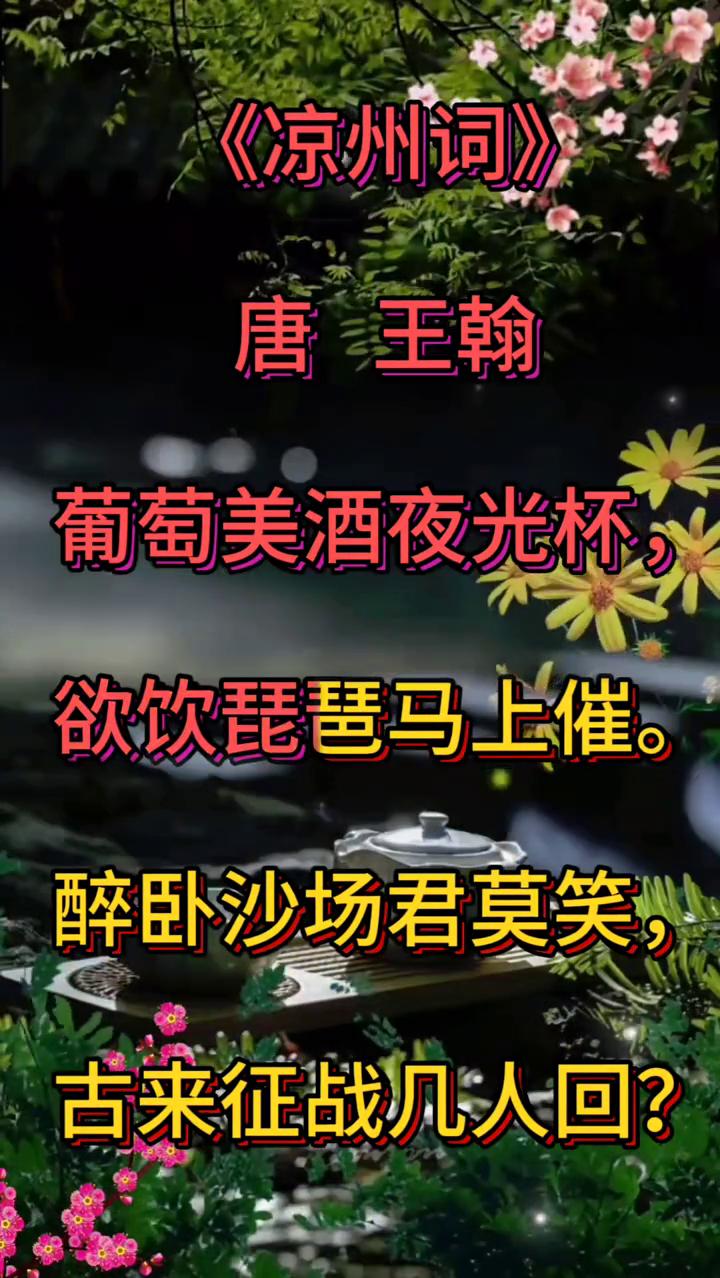 《凉州词》 唐,王翰。 葡萄美酒夜光杯,欲饮琵琶马上催。 醉卧沙场君莫笑,古来征战几人回? 这首诗以豪放的笔触描绘了边塞将士在征战前畅饮美酒的场景,既展现了将士们的豪迈气概,又暗含了对战争残酷的深沉感慨,是盛唐边塞诗中极具代表性的作品。