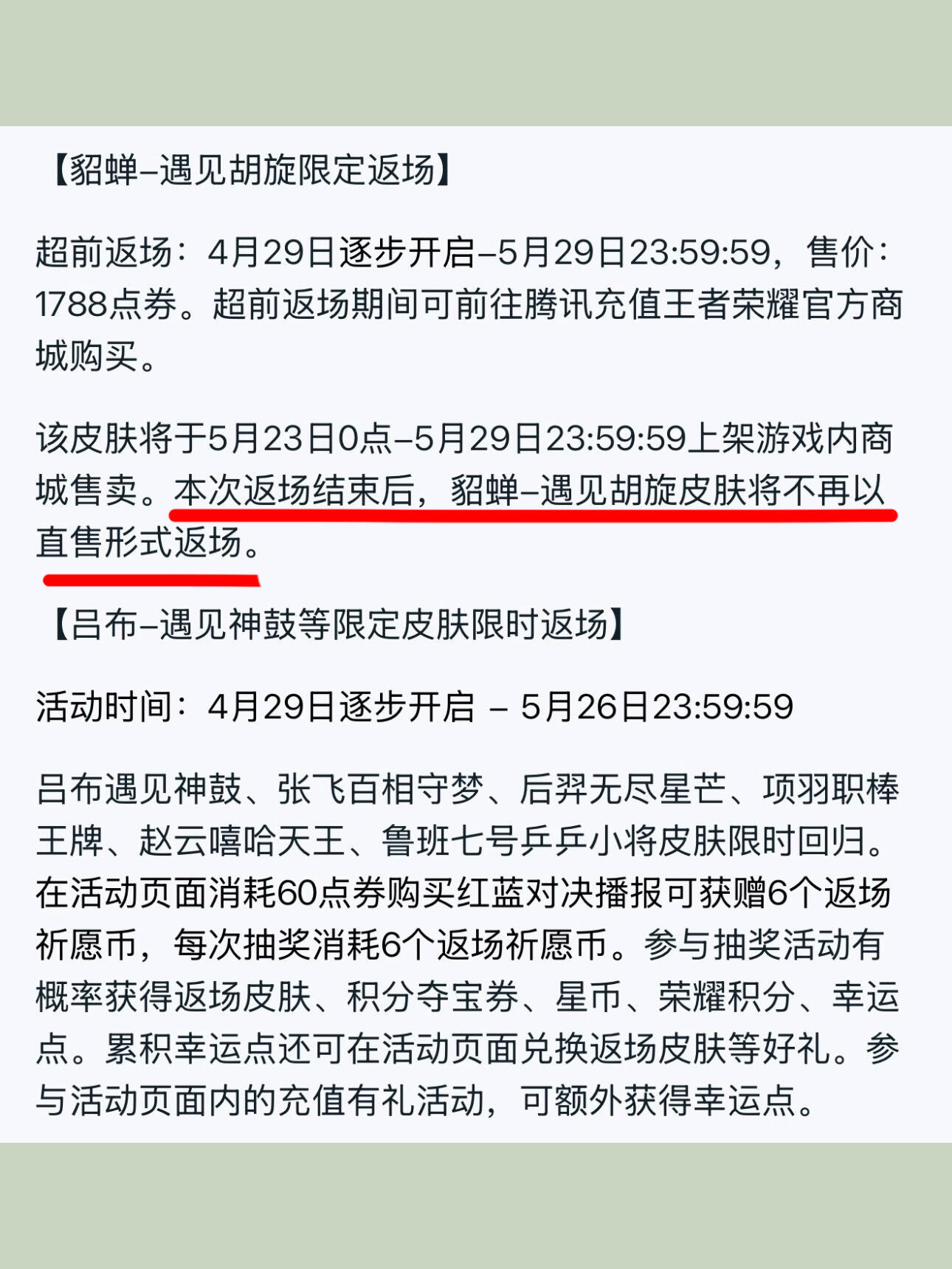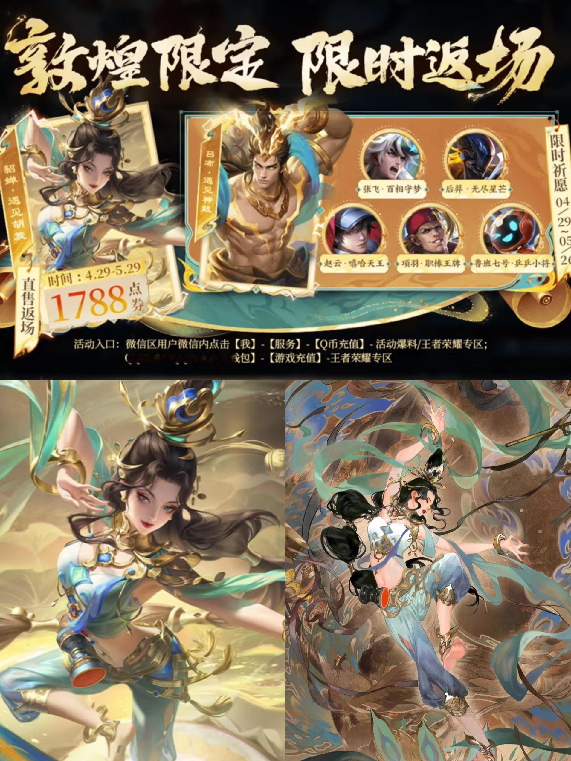 王者敦煌系列皮肤返场去年周年庆的遗憾这次可以弥补了,因为是最后一次直售返场啦,喜欢这个皮肤的宝宝千万别再错过了。胡旋的手感很好,建模很美,算是敦煌系列口碑最好的皮肤了~能返场真的太开心啦!王者敦煌系列皮肤返场王者荣耀