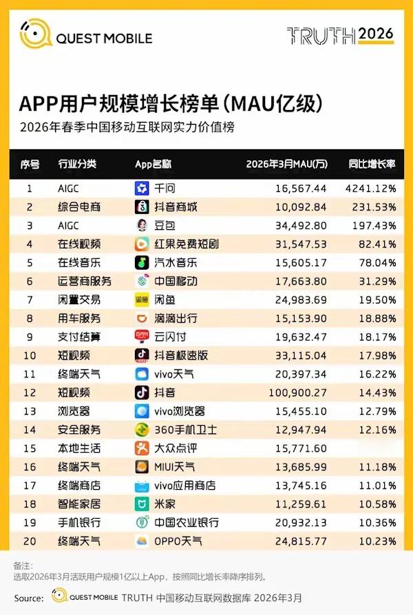 QuestMobile发布2026年春季中国移动互联网实力价值榜,抖音月活跃用户规模正式突破10亿。