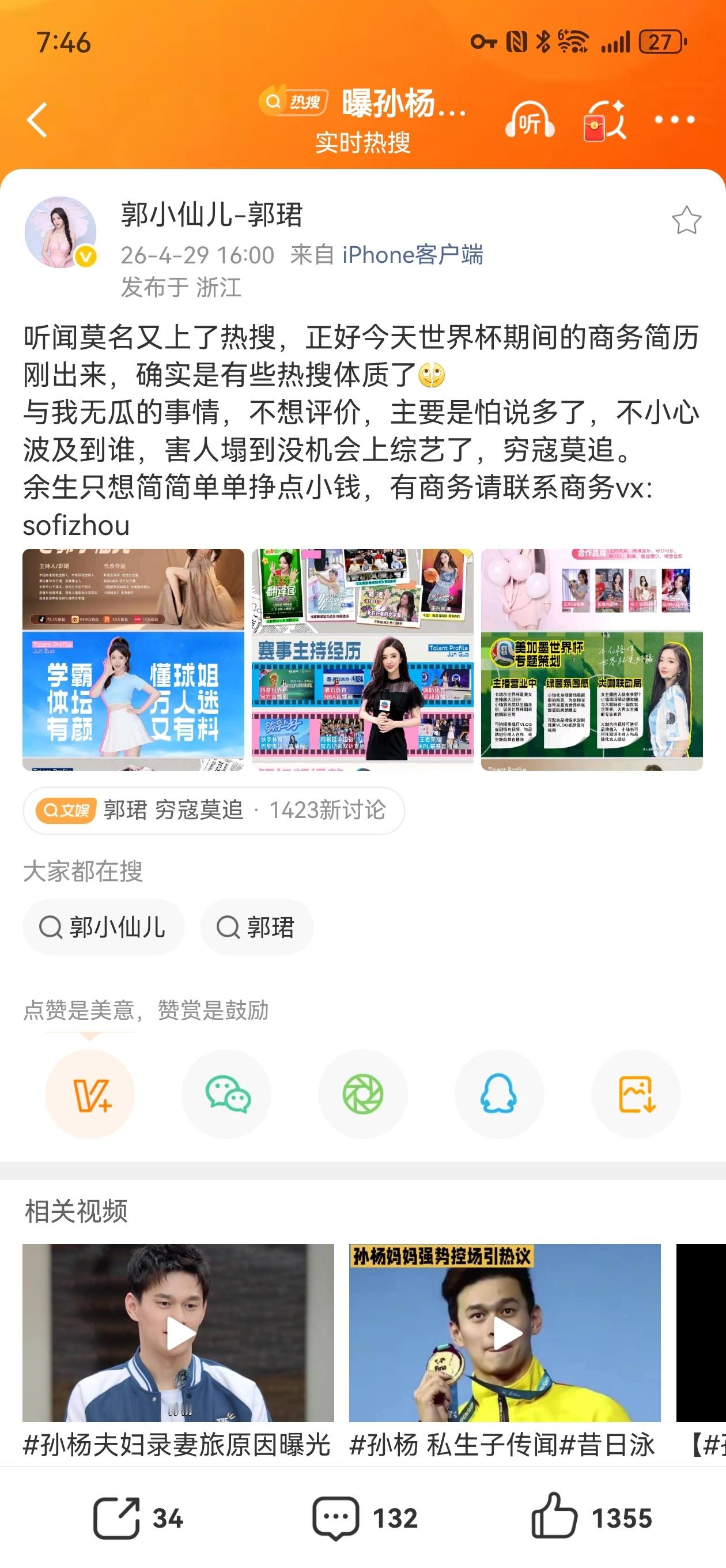 孙杨前女友发这个如果是真的那么孙杨他妈就太可怕了…… 孙杨之前药检事件是不是他妈也有责任?孙杨夫妇录妻旅原因曝光孙杨 郭珺孙杨前女友曾被称为武大女神孙杨 私生子传闻