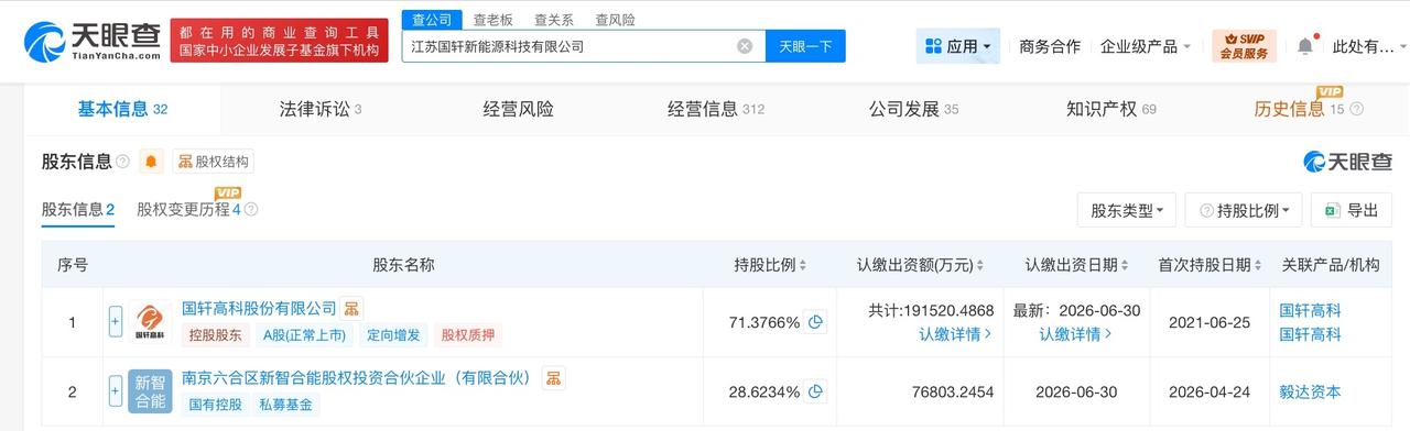 江苏国轩新能源科技有限公司成立于2021年6月,法定代表人为张巍,经营范围含技术进出口、电池制造、电池销售、新能源汽车废旧动力蓄电池回收及梯次利用等。股东信息显示,该公司现由国轩高科(002074)、南京六合区新智合能股权投资合伙企业(有限合伙)共同持股。