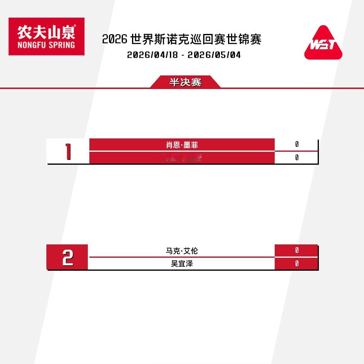 四强比赛安排,上半区,肖恩·墨菲 vs 约翰·希金斯,下半区马克·艾伦 vs 吴宜泽。
