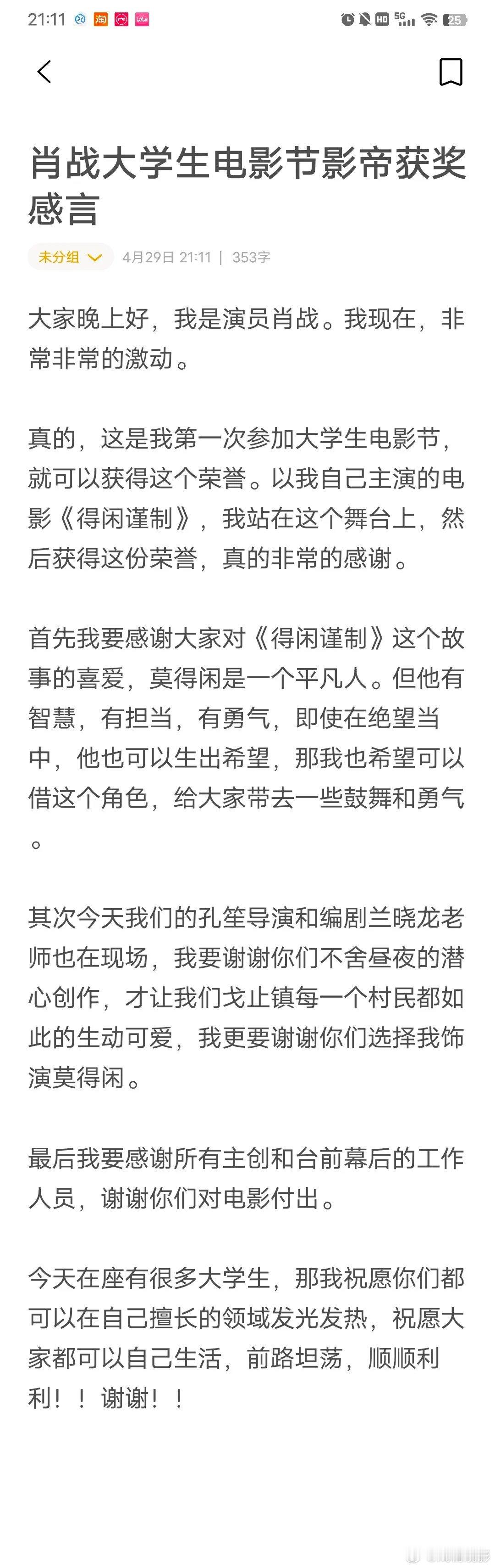 肖战获奖感言很感人!大家晚上好,我是演员肖战。我现在,非常非常的激动。真的,这是我第一次参加大学生电影节,就可以获得这个荣誉。以我自己主演的电影《得闲谨制》,我站在这个舞台上,然后获得这份荣誉,真的非常的感谢。首先我要感谢大家对《得闲谨制》这个故事的喜爱,莫得闲是一个平凡人。但他有智慧,有担当,有勇气,即使在绝望当中,他也可以生出希望,那我也希望可以借这个角色,给大家带去一些鼓舞和勇气。其次今天我们的孔笙导演和编剧兰晓龙老师也在现场,我要谢谢你们不舍昼夜的潜心创作,才让我们戈止镇每一个村民都如此的生动可爱,我更要谢谢你们选择我饰演莫得闲。最后我要感谢所有主创和台前幕后的工作人员,谢谢你们对电影付出。今天在座有很多大学生,那我祝愿你们都可以在自己擅长的领域发光发热,祝愿大家都可以恣意生活,前路坦荡,顺顺利利!!谢谢!!