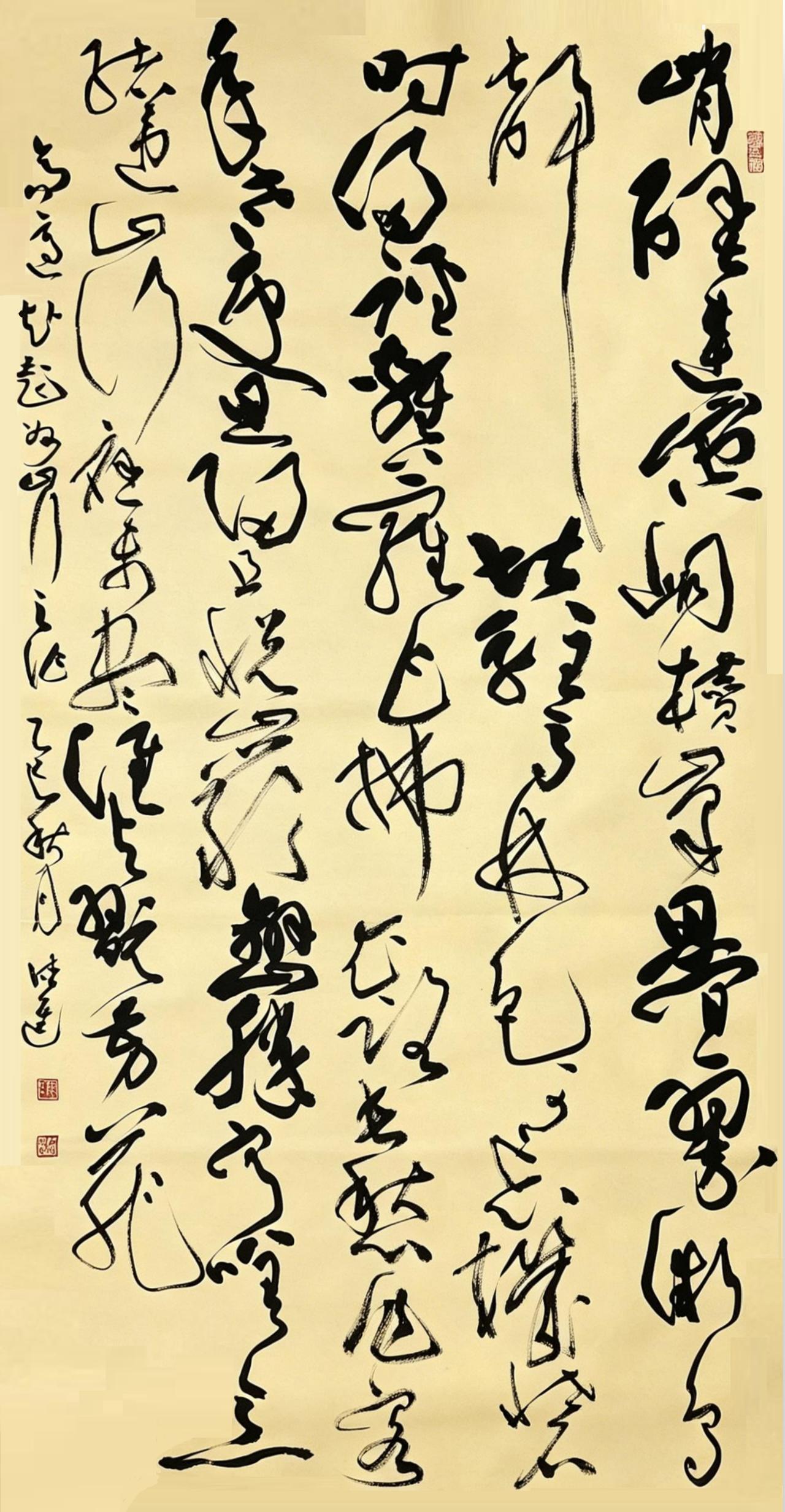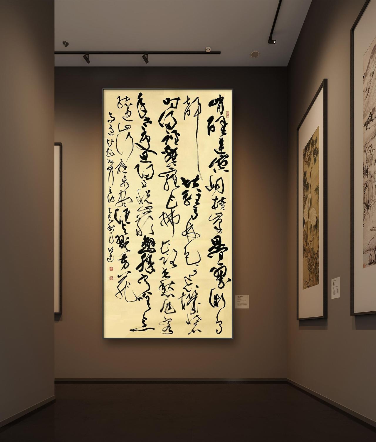 草书创作重在笔势贯通,行气连绵,以牵丝映带串联字句,做到形断意连。笔法上虚实相融,提按顿挫分明,线条劲健灵动,兼具苍润质感。结体讲究开合变化,大小错落、疏密相生,避免排布呆板。