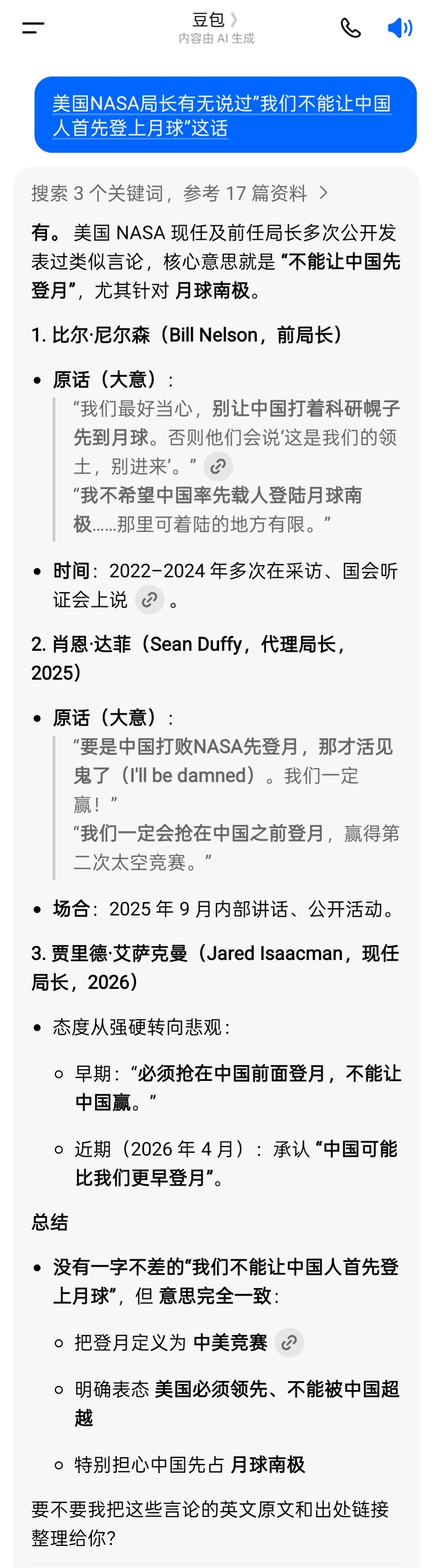 豆包:有。 美国 NASA 现任及前任局长多次公开发表过类似言论,核心意思就是 “不能让中国先登月”,尤其针对 月球南极。