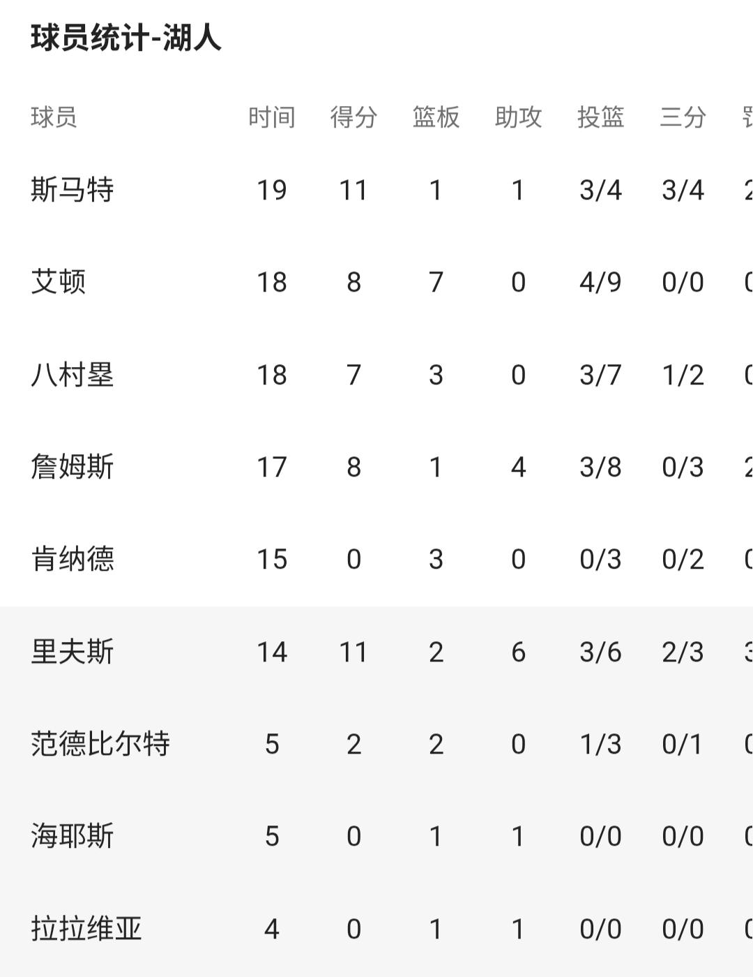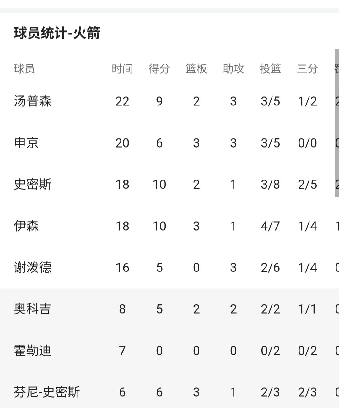 虽然湖人队里弗斯本场复出状态手感不错,但前几场发挥出色的肯纳德手感冰凉,半场结束3投0中怒砍0分,反观火箭队汤普森、史密斯、伊森发挥都比较出色,分别得到9分、10分、10分,在防守端火箭队也做得非常好,这才是火箭队应该有的活力。