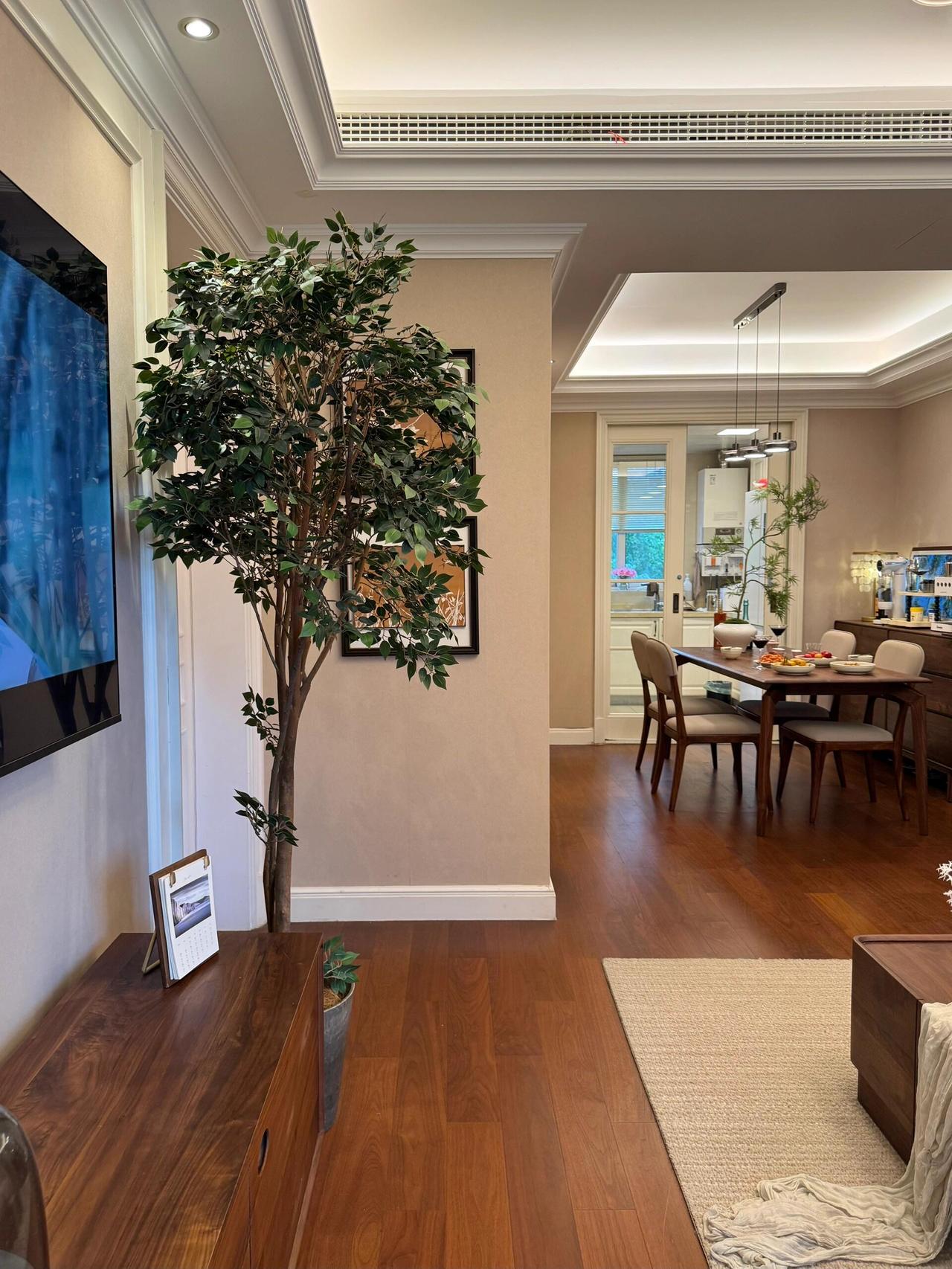 建面143平,套内118,四房两厅两卫,不算大,但住进这个精装房后,我们什么硬装都没动:木地板通铺、墙纸贴好、环形吊顶保留,阳台也保持着原样,只用软装一点点搭起一个胡桃木色的家,没有定制柜,也没有多余的改装。