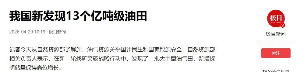 4月29日,央视新闻报道,国内一口气确认13个亿吨级油田,连带一批大型气田同时现身。规模摆在这儿,外媒看完也忍不住酸一句,这运气也太“带油”了吧!
