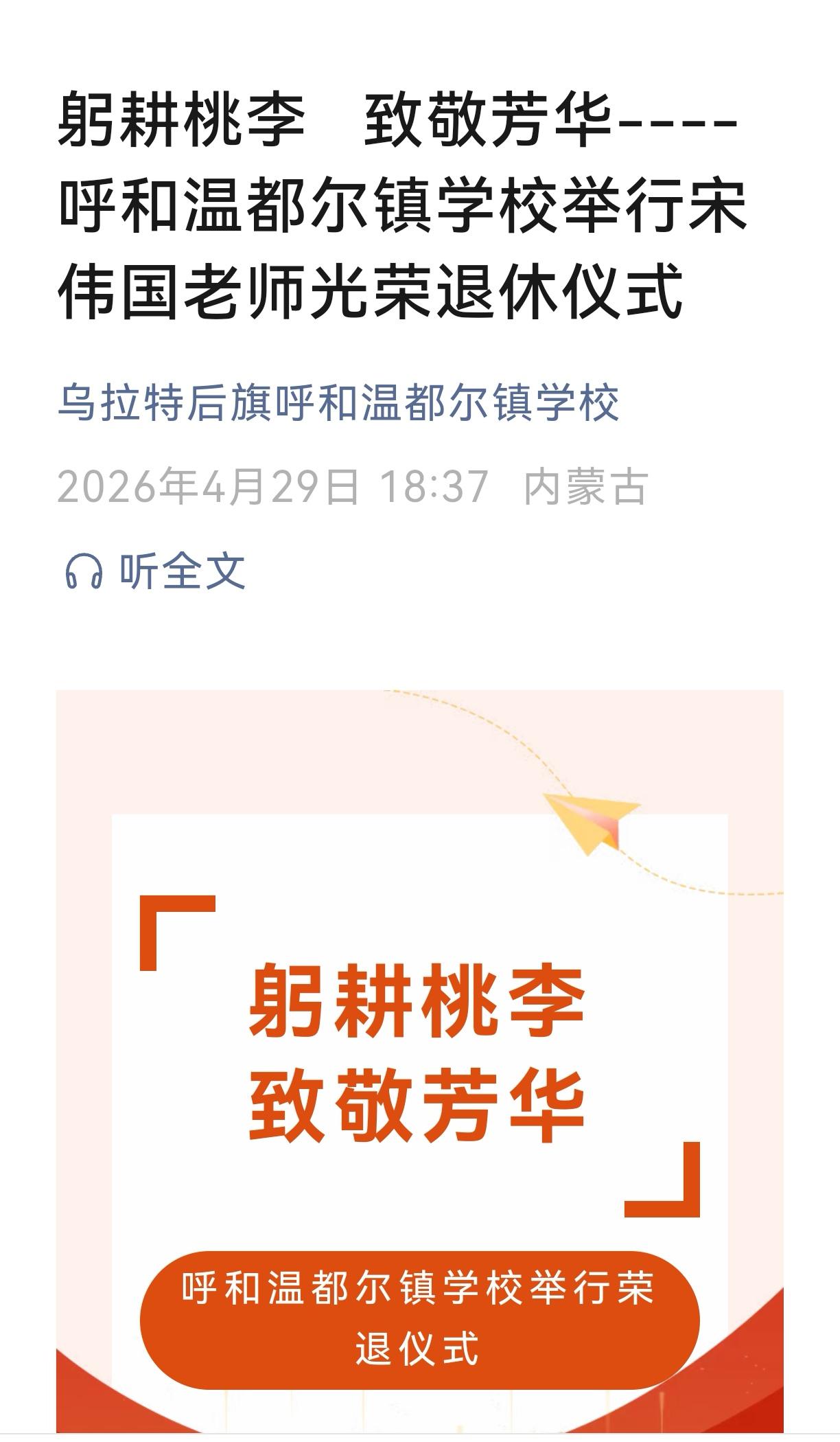内蒙古自治区乌拉特后旗呼和温都尔镇学校举行宋伟国老师光荣退休仪式!
