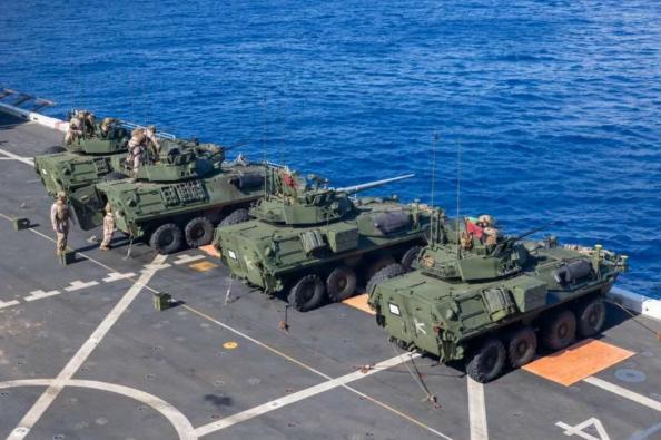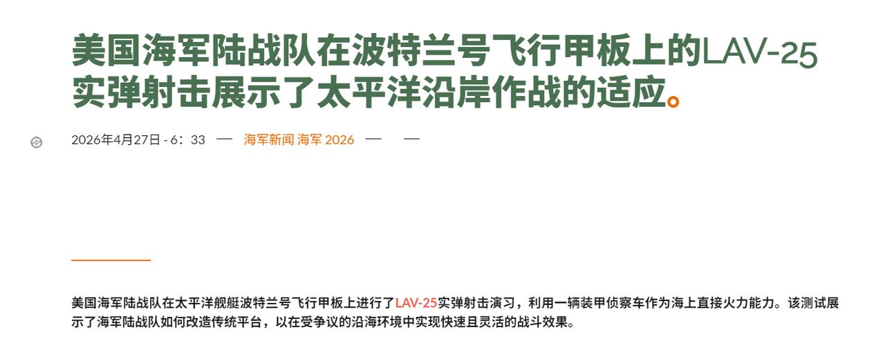 美国印太司令部4月27日自己放出一组照片:海军陆战队把LAV-25轮式装甲车拉上“波特兰”号两栖攻击舰,在飞行甲板上搞齐射训练。官方的说法是提升“海上环境下的射击精度”,听着挺专业,但翻翻这款战车的家底就全露馅了——主武器是一门25毫米机关炮,打主战坦克都费劲,在海战里撑死给敌方军舰蹭掉一层漆。美军把一个连坦克都啃不动的家伙架到十三万吨的巨舰上,唯一合理的解释是防快艇。伊朗革命卫队那种造价几十万美元的武装快艇,狼群一样贴上来,几艘同时突击,美军现役的“密集阵”和“标准”系列根本来不及拦。实在没招了,只能把陆战队的轮式步战车当移动炮台顶上。堂堂全球第一海军,被几艘小快艇逼出了心理阴影,这画面本身比什么智库报告都诚实。