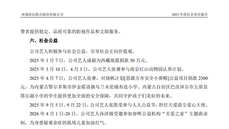 欢瑞报告提及成毅积极参与公益 近日,欢瑞世纪联合股份有限公司发布2025年度社会责任报中,提到《莲花楼》在海外市场斩获超高口碑与热度,热播期间包揽爱奇艺国际版多国及地区播放榜单首位,成为弘扬中华优秀文化、展现中国文化自信的典范之作,有力推动中国文化在世界舞台绽放独特光彩。报告还提到,公司艺人积极参与社会公益,引导社会正向价值观。 2025 年 1 月 7 日,公司艺人成毅为西藏地震捐款 50 万元。2025 年 3 月 10 日、4 月 3 日,公司艺人张睿参与南京红山动物园认养计划。
