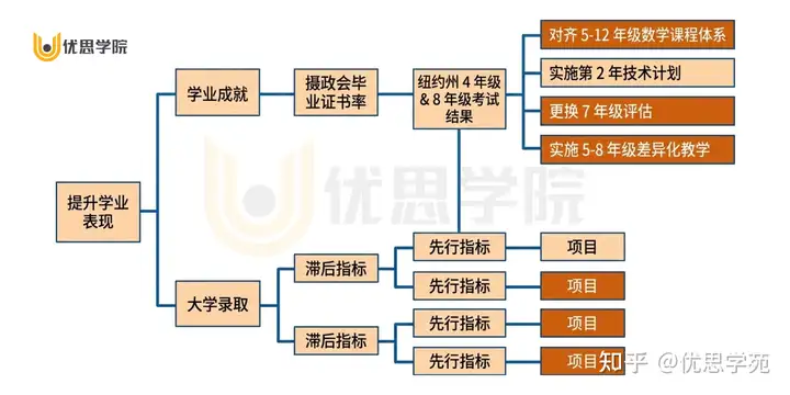 该学区设定了三个核心目标。其中第一个目标是 提升学术表现(academic performance),上图展示了这一目标的部分结构。学区领导者进一步识别出两个战略性目标,只要这两个目标实现,就能够推动学术表现的提升:学术成就(academic achievement) 和 大学录取率(college admissions)。