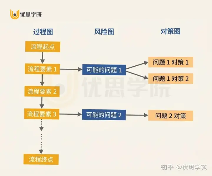 将上述步骤表示在图形中,PDPC技术表示方法见下图。图形由过程图、风险图和对策图三部分组成,在实践中PDPC技术的图形形式并没有严格的规定。可以是纵向的图形,也可以是横向的图形。