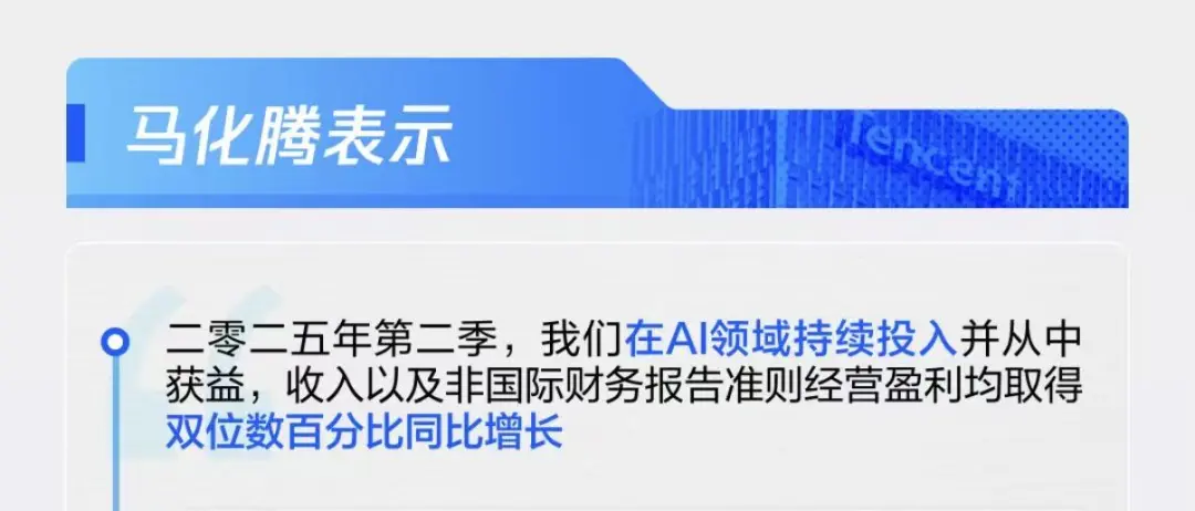 此前,马化腾就强调:“二季度,我们在AI领域持续投入并从中获益。”
